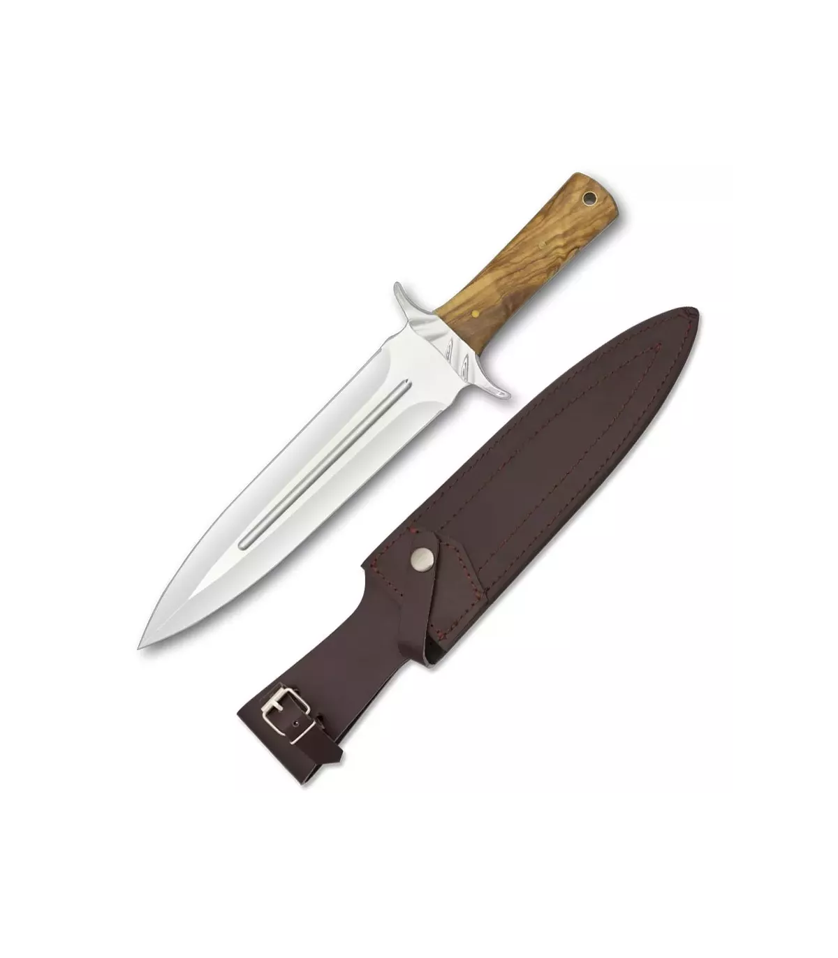 Opdag elegance og funktionalitet i jagtkniven til afslutning med håndtag af oliventræ. Denne kniv kombinerer et smedet blad i højkvalitets rustfrit stål med et håndtag af oliventræ, hvilket skaber et enestående værktøj til dine jagteventyr.