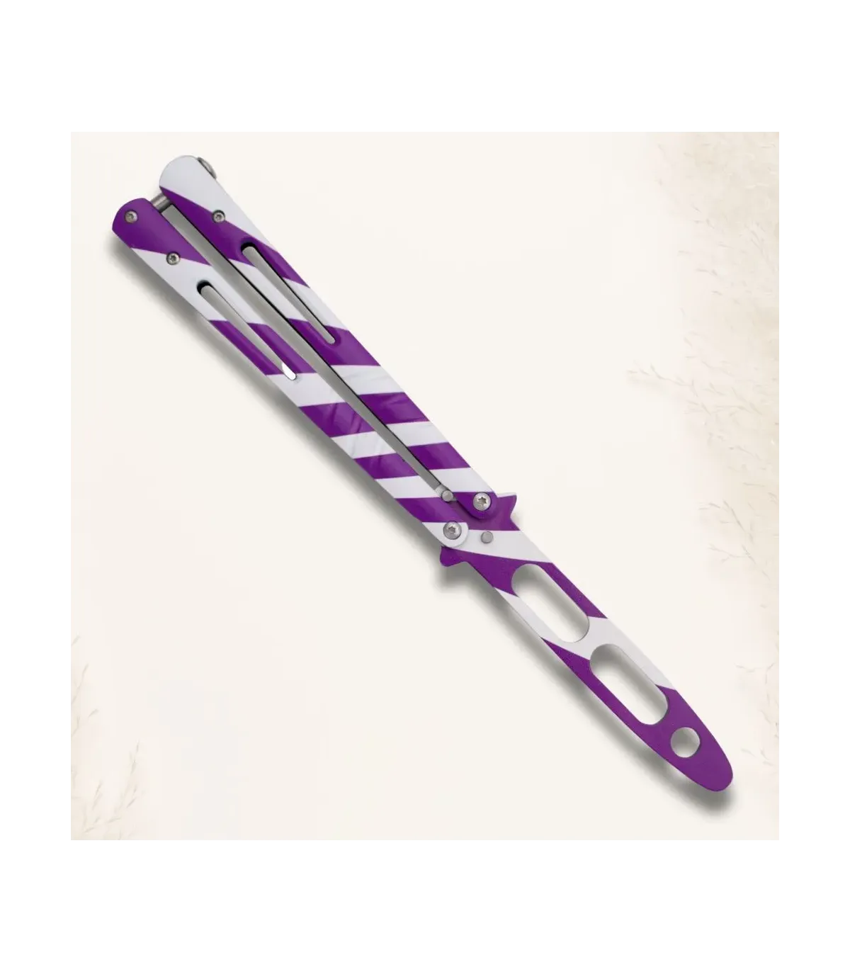 Det slanke design, med en finish i hvidt og lilla, gør den ikke kun visuelt tiltalende, men fremhæver også dens moderne og karakteristiske udseende. Hvert eneste detalje, fra skårne linjer til det diagonale stribemønster, er omhyggeligt tænkt for at give en unik brugeroplevelse. Denne genstand, der minder om de berømte butterfly-knive, har en åbne- og lukkemekanisme, der ikke kun er funktionel, men også tilføjer et strejf af dygtighed og færdighed i brugen.
