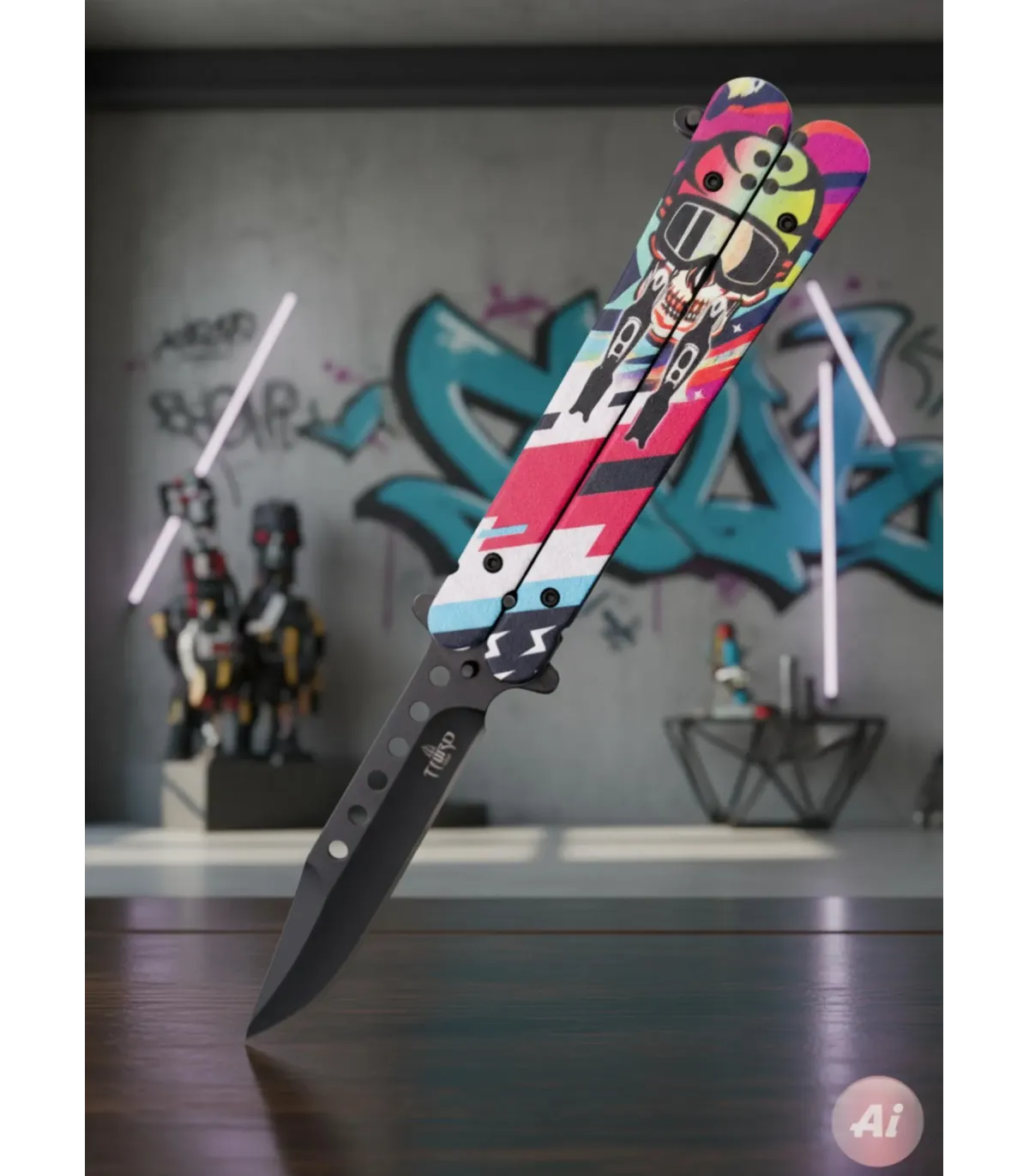 Aluminiumshåndtaget, dekoreret med et 3D-tryk af en skalle, tilføjer en fantasifuld og dristig karakter, perfekt til elskere af iøjnefaldende designs og samlere, der ønsker et objekt med personlighed. Takket være sin afbalancerede vægt og ergonomiske struktur tilpasser denne lette navaja sig komfortabelt til hånden, hvilket giver enestående kontrol i hver bevægelse.