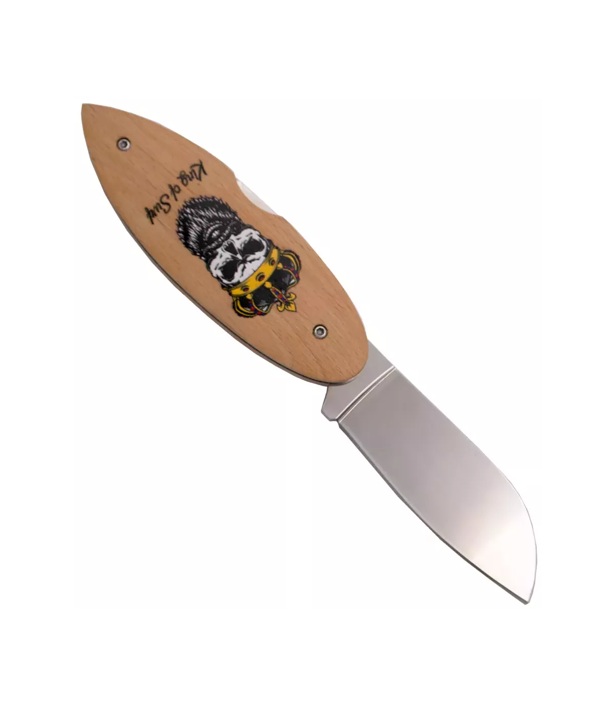 Håndtaget, lavet af bøg, tilføjer et naturligt og holdbart præg til knivens design. Det, der adskiller modellen King of Surf M2, er trykket af kranier på begge sider af håndtaget, hvilket giver et dristigt og karakteristisk præg. Denne dekoration giver ikke kun et unikt udseende, men sikrer også et fast og behageligt greb, ideelt til daglig brug eller udendørs eventyr.