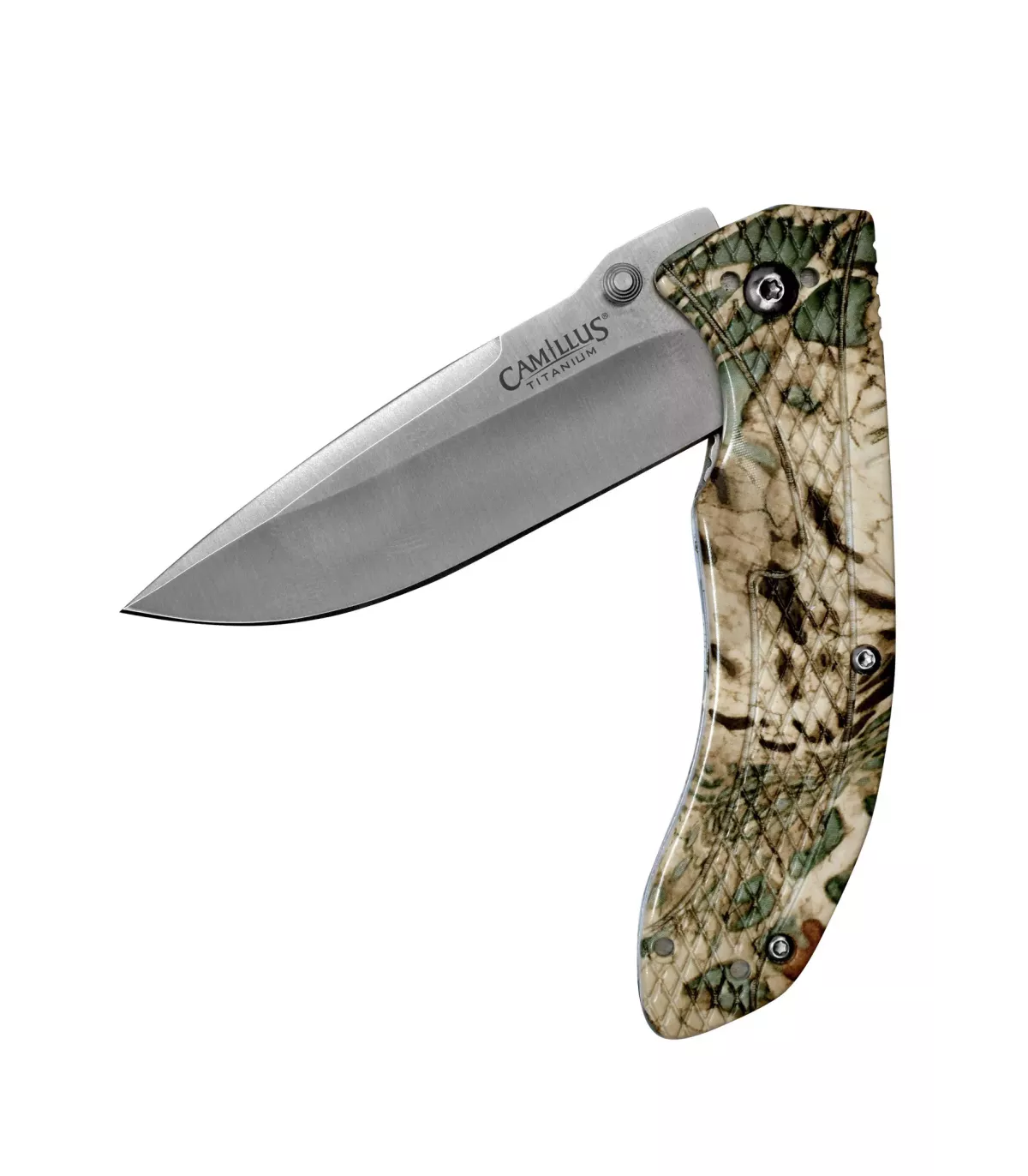 - Titanium-behandlet stål: Vil du have en kniv, der forbliver skarp længere? Camillus GUISE har det dækket! 420-stålbladet er behandlet med titanium, hvilket gør det op til 3 gange mere modstandsdygtigt end ubehandlet stål. Det betyder, at du kan stole på, at din kniv bevarer sin skarphed selv efter langvarig brug.