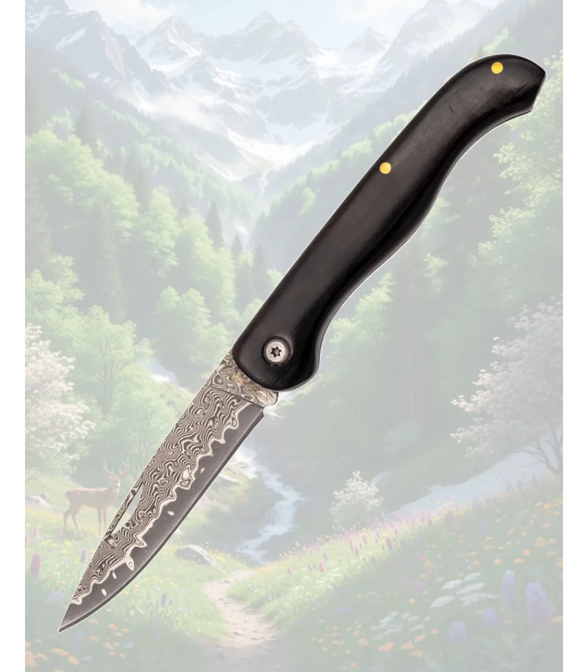 Grebet i ebenholz giver en varm fornemmelse og en elegant tilstedeværelse, med en kurvatur, der er designet til at passe naturligt i hånden og reducere træthed under brug. De synlige nitter og det robuste pivote giver en følelse af soliditet, hvilket giver en følelse af sikkerhed og pålidelighed hver gang du folder klingen ud. Dens foldbare struktur gør den praktisk at transportere uden at gå på kompromis med følelsen af kvalitet.