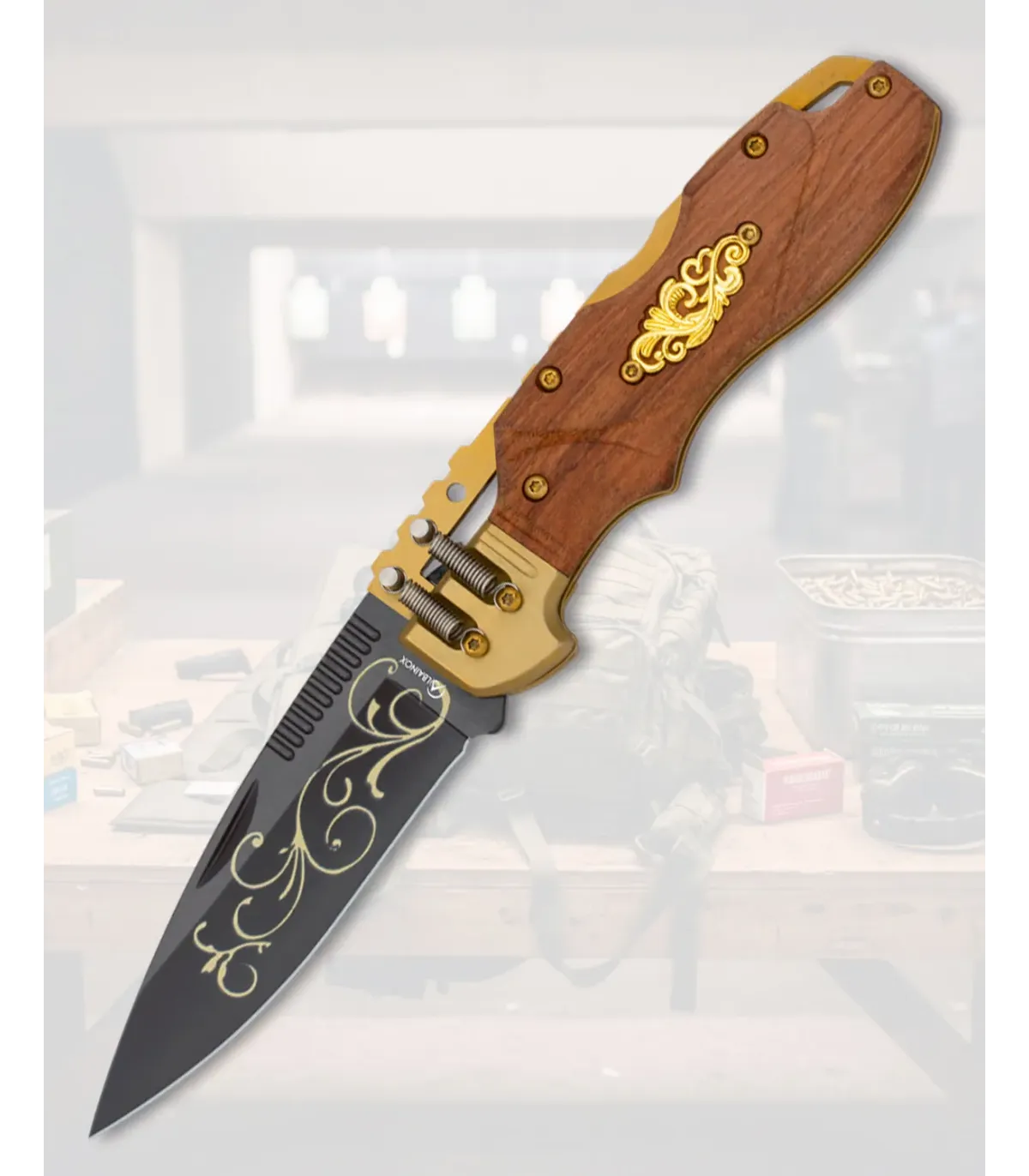 Kombinationen af et mørkt blad med delikate dekorative streger og et håndtag, der ligner træ i en varm tone, gør denne genstand til mere end et værktøj; det er et komplement med karakter. Den gyldne dekoration på håndtaget og de metalliske finish giver et klassisk og sofistikeret præg, perfekt til den, der værdsætter æstetik uden at give afkald på funktionalitet.