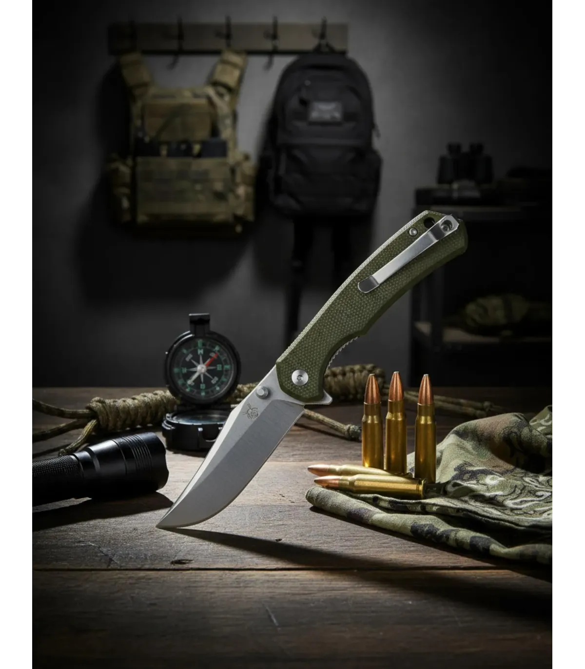 D2 taktisk kniv med grøn Micarta skal
