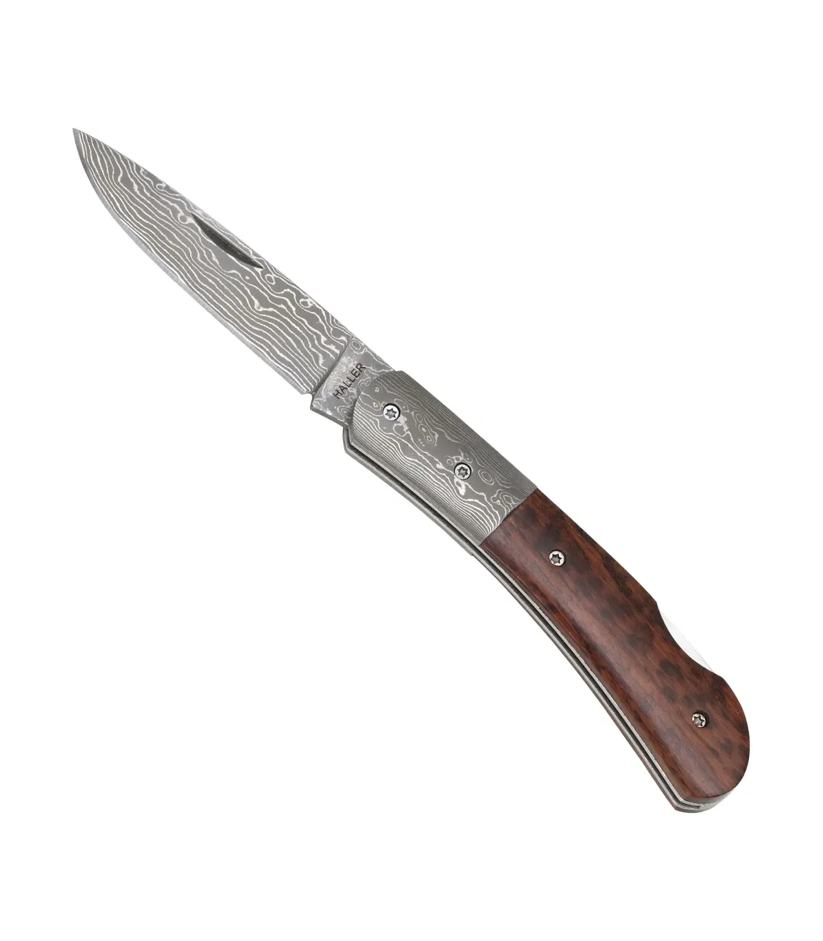 Det buede håndtag, arbejdet i slange træ, tilpasser sig hånden og giver et varmt og sikkert greb, mens sektionen nær klingen gentager det metalmønster for at forbinde design og funktionalitet. Åbningens fordybning gør det let at starte skæret med en naturlig gestus, og låsesystemet bagtil giver tillid til arbejdet, idet det holder klingen fast, indtil du beslutter at gemme den.