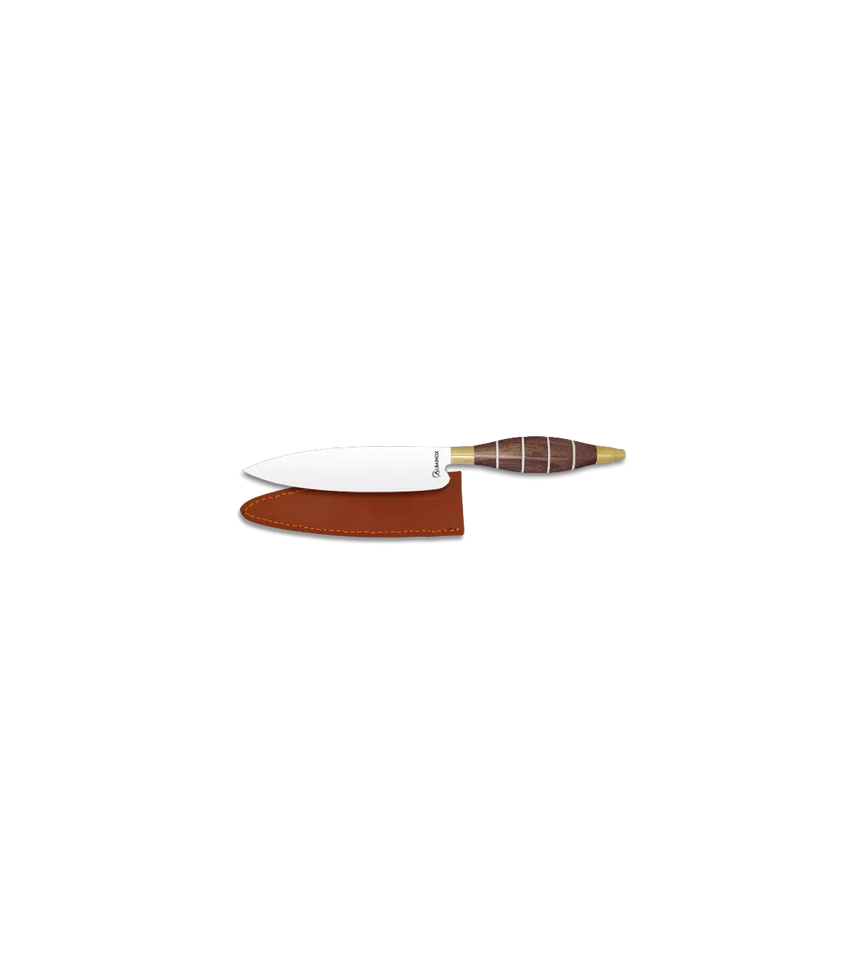 Den Canariske kniv leveres med en brun læderhylster, perfekt til at beskytte din kniv, når den ikke er i brug. Derudover har den en messingring, som ikke blot forbedrer håndtagets stabilitet, men også tilføjer et præg af elegance til det overordnede design.