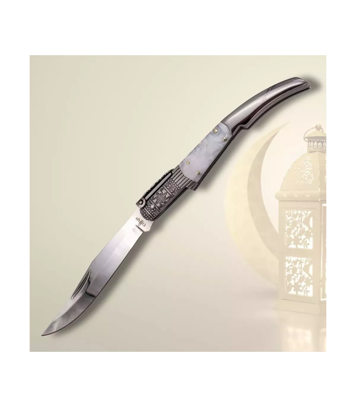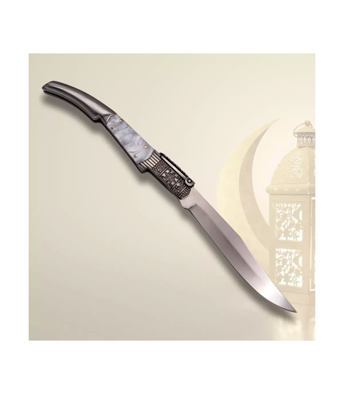 Hvert eneste detaljer i denne kniv er omhyggeligt tænkt igennem, fra fjederen til den dekorerede palank, hvilket afspejler en enestående håndværkskunst. Derudover leveres den i en elegant æske, hvilket gør den til den perfekte gave til særlige øjeblikke eller til at tilføre værdi til din egen samling.