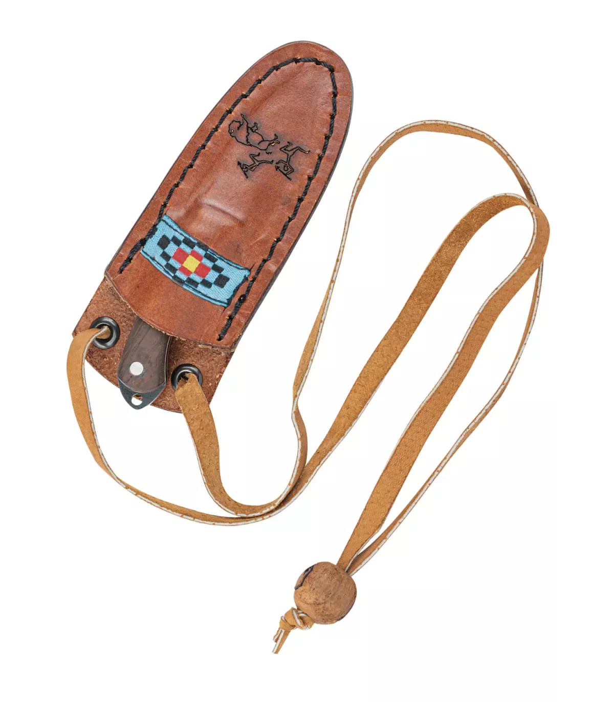 Med en samlet længde på cirka 12,7 cm og et blad på cirka 5,9 cm er Blue River Halskniv let at have med overalt. Håndtaget i valnød med turkisfarvede stenindlæg giver kniven en unik indiansk karakter.