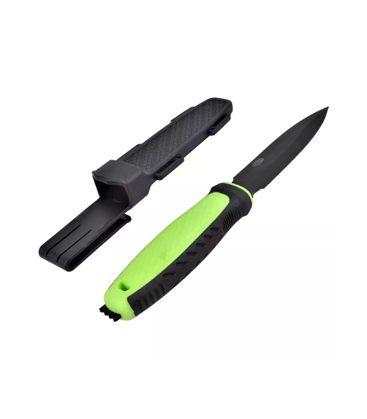SCK eventyrkniven har også et sort og grønt design, der får den til at skille sig ud blandt andre eventyrknive. Med et blad på 110 mm og en samlet længde på 235 mm (240 mm med hylster) er denne kniv tilstrækkelig kompakt til at tage med på dine eventyr uden at optage for meget plads. Den vejer kun 110 g (145 g med hylster), hvilket gør den let nok til at bære den hele dagen.