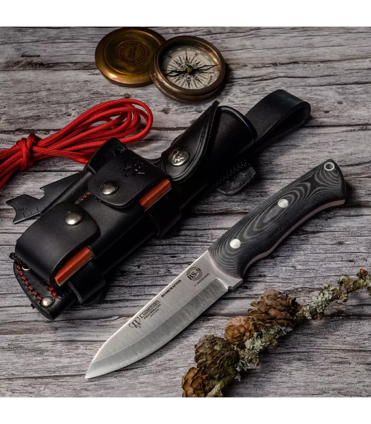 Kniven har en bred skandinavisk slibning og satinfinish med drop-point spids, hvilket giver enestående skarphed og kontrol under skæring. Derudover er dens sorte satin-micartahåndtag med rød separator behageligt og skridsikkert, hvilket sikrer et sikkert og stabilt greb, selv under ekstreme forhold.