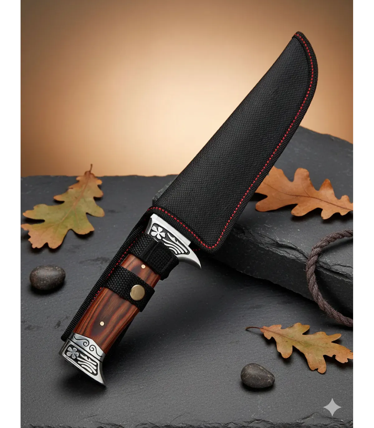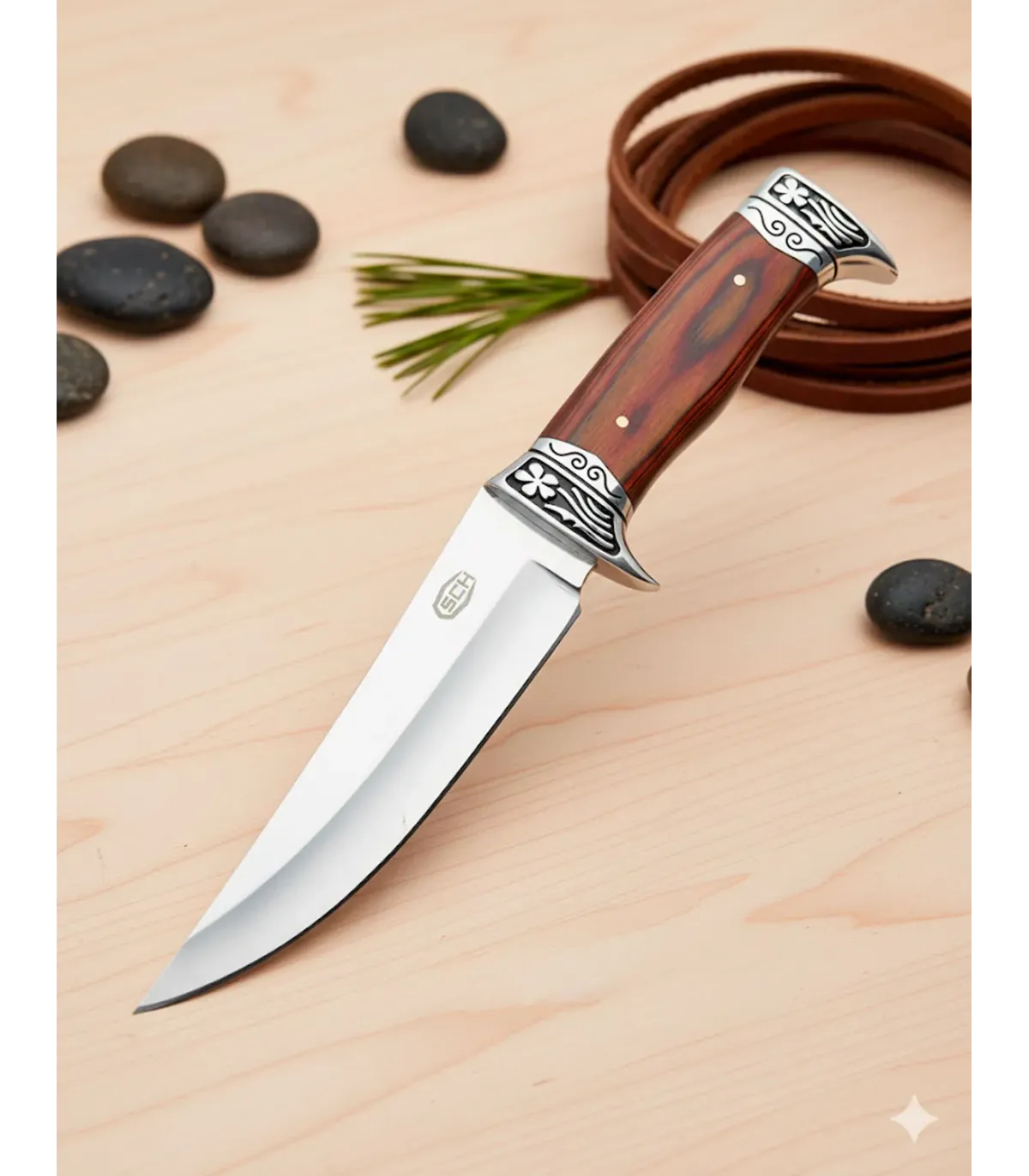 Er du på udkig efter en pålidelig partner til dine udendørs eventyr? Denne SCK jagtkniv kombinerer godt design og funktionalitet for at følge dig på hver ekspedition. Det rustfri stålblad på 175 mm giver præcise snit, er modstandsdygtigt over for korrosion og holdbart, ideelt til krævende opgaver. Håndtaget, lavet af træ med dekorative åre og indgraverede metaldetaljer, giver et ergonomisk greb og et elegant udseende, der afspejler robusthed og stil. Derudover har den et nylonhylster med clip til bælte, hvilket gør den nem at transportere og tilgængelig når som helst. Med en vægt på 330 g (390 g med hylster) er den let men solid, hvilket sikrer komfort uden at gå på kompromis med styrke. Inspireret af jagttraditionen kombinerer denne kniv dekorative elementer med et praktisk design, hvilket gør hver brug til en tilfredsstillende oplevelse. Det er et alsidigt værktøj til indsamling, forberedelse eller blot beundring. Hvis du vil købe en jagtkniv, der skiller sig ud med sin kvalitet og stil, er denne model med blank finish, kunstneriske detaljer og logoet “SCH” dit bedste valg til at stole på i enhver situation.