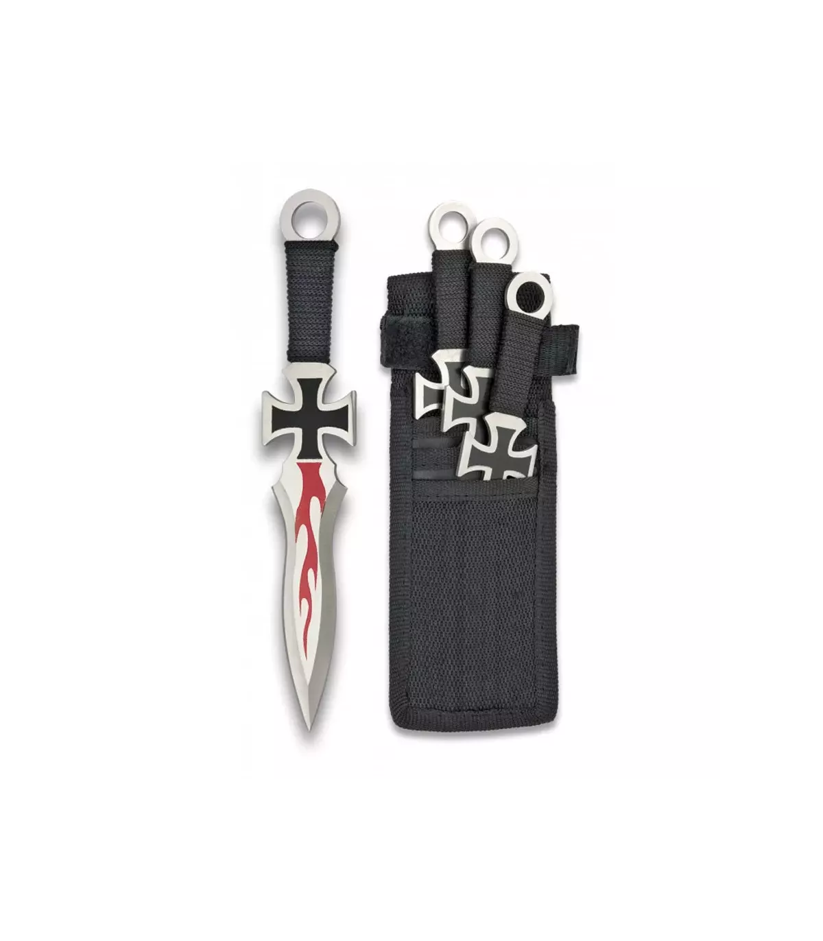 Det, der gør dette sæt særligt, er designet af den celtiske kors på hver kniv, hvilket giver dem et karakteristisk og elegant præg. Derudover leveres sæt med 3 enkeltbladede kastknive model Cruz Celta med en nylonetui for at holde dem sikre og beskyttede, når du tager dem med dig.