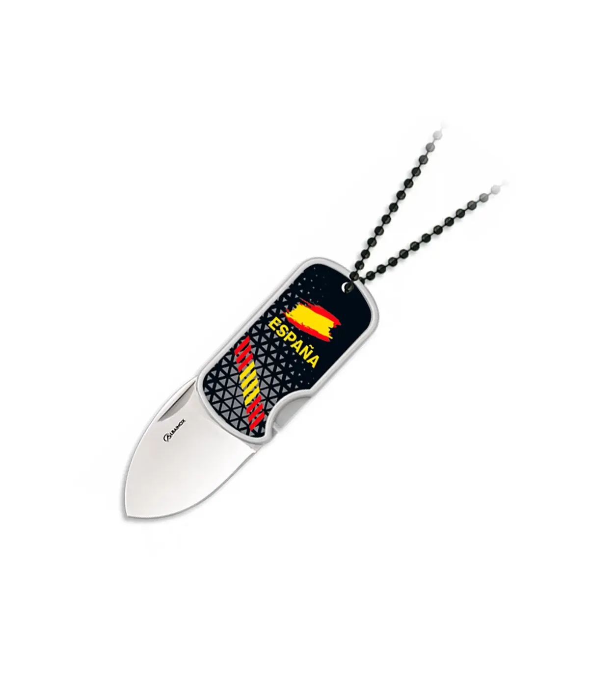 Navaja bandera Española con hoja en acero 3CR13MOV satinado de un solo filo y mango en aluminio + 3D con colgante de bolas. Tipo de bloque Frame Lock. Tamaño de la hoja: 4 cm.