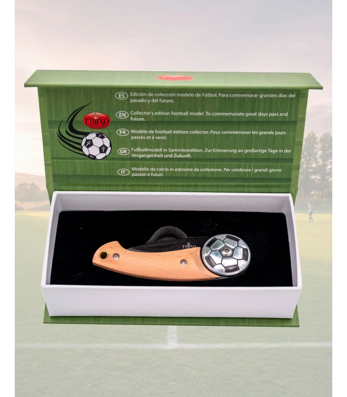 Den leveres i en æske, der fremhæver dens karakter som gave, perfekt til at overraske fodboldentusiaster eller samlere, der søger et stykke med personlighed. Kombinationen af klassiske materialer og sportslige detaljer gør den til et valg, der er både funktionelt og æstetisk.