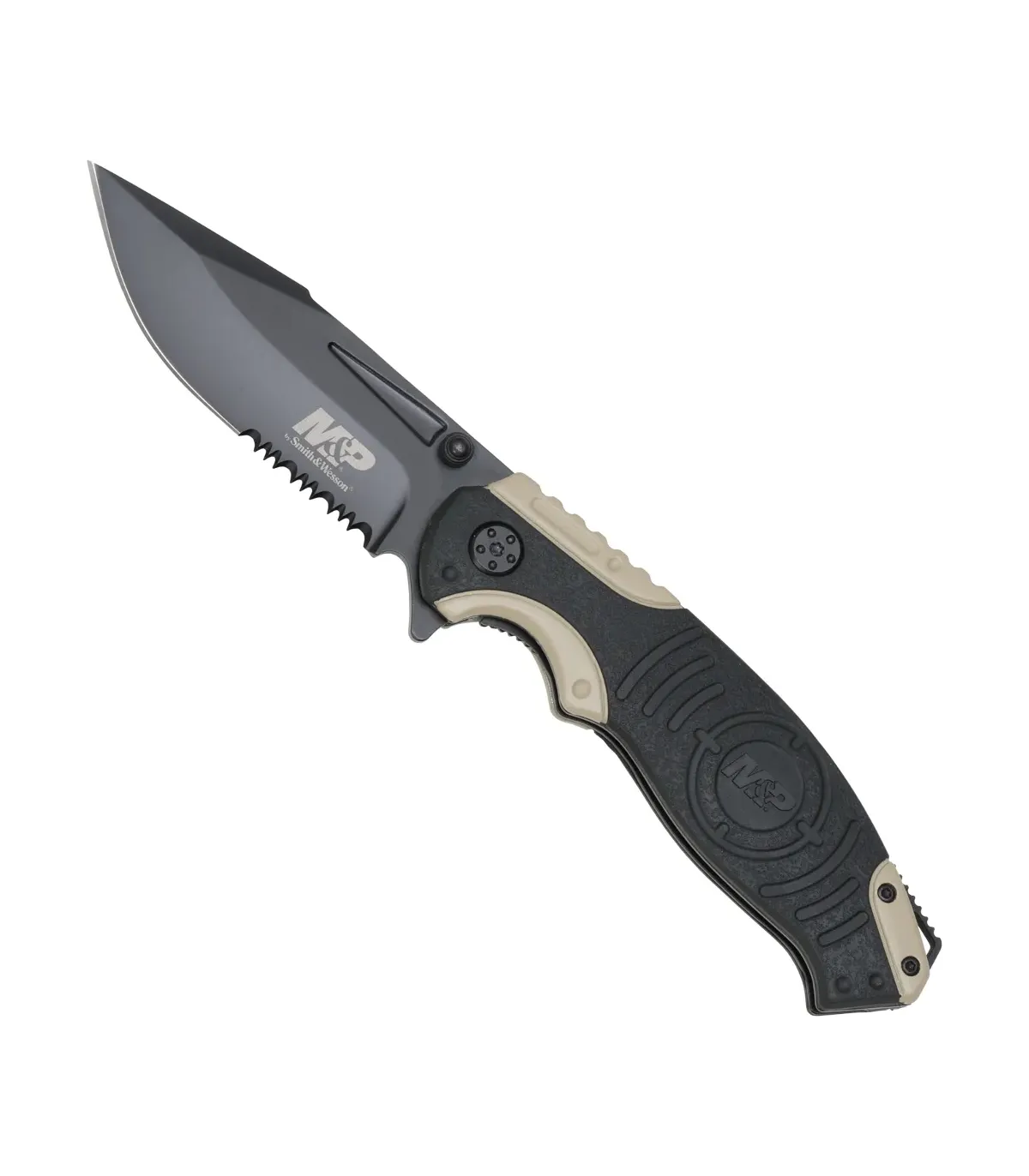 Smith and Wesson Taktisk Militær Politilås kombinerer en mørk klinge med mat finish og en delvist sagtskarpet profil, så du nemt går fra præcise snit til opgaver, der kræver mere greb, som reb eller hårde materialer. Behandlingen af klingen sikrer slidstyrke og holder skæret, så du ikke konstant skal bekymre dig om det.