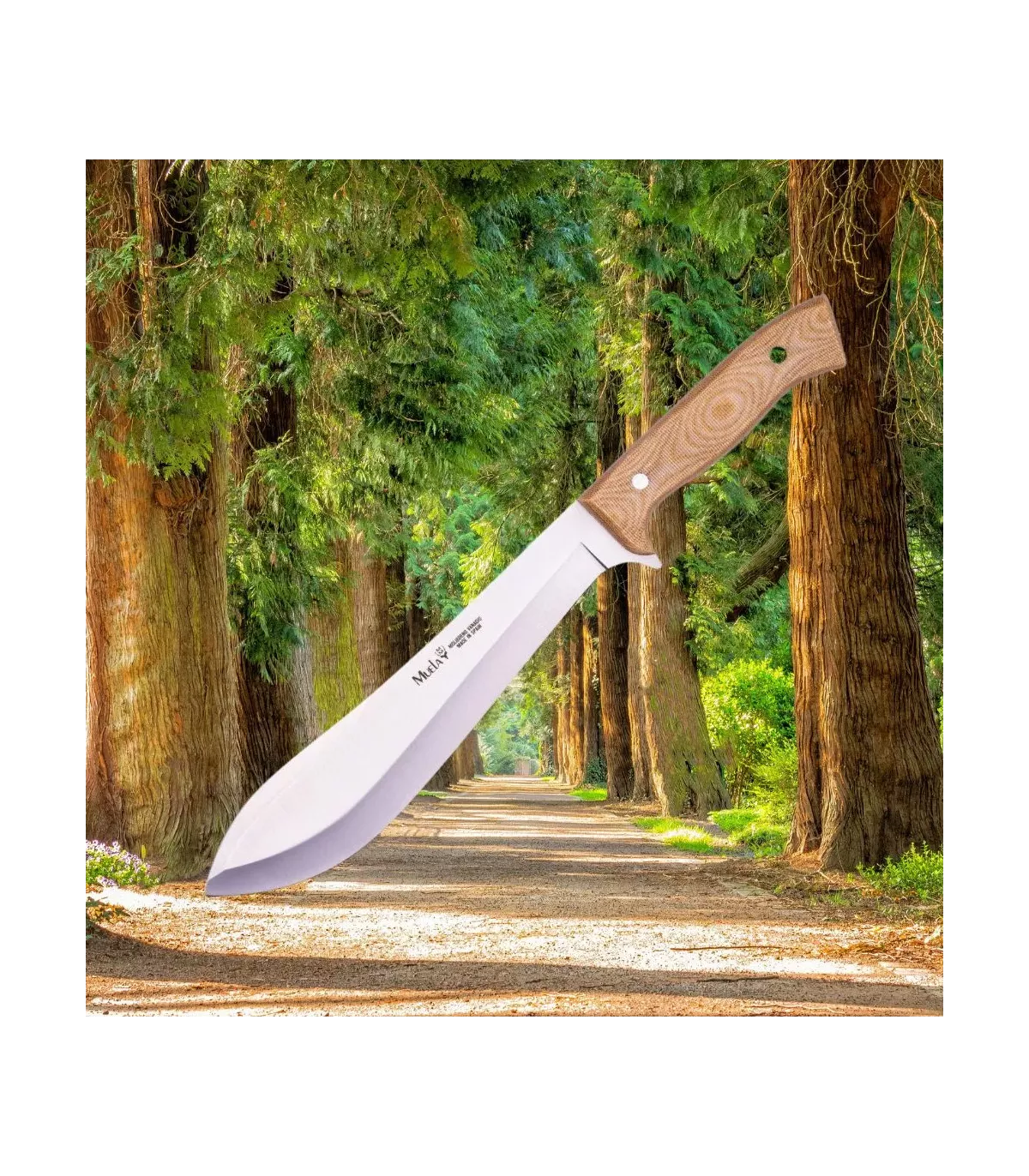 Håndtaget, lavet af micarta, er ergonomisk og passer perfekt til din hånd, hvilket sikrer et behageligt og solidt greb. Med sit afbalancerede design og vægt i fronten forstærker det naturligt hver skæring, du foretager. For større bekvemmelighed inkluderer den en høj kvalitet brun læderhylster, der beskytter din machete og gør den nem at transportere.