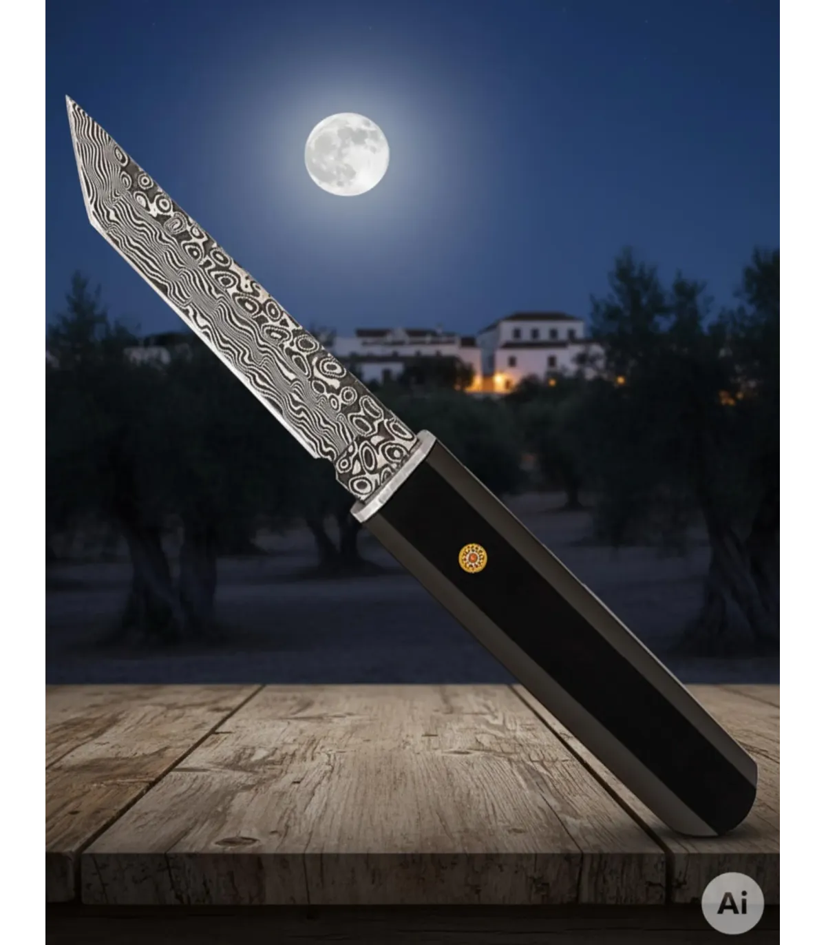 Det sorte elfenbenstræshåndtag med en elegant finish og dekorativ mosaik giver et behageligt og sikkert greb, der kombinerer komfort og æstetik. Inkluderer en sort elfenbens træskede, der beskytter bladet og gør det nemt at transportere, perfekt til at tage med dig med tillid. Derudover tilføjer rustfrit stålring en sofistikeret og holdbar detalje.
