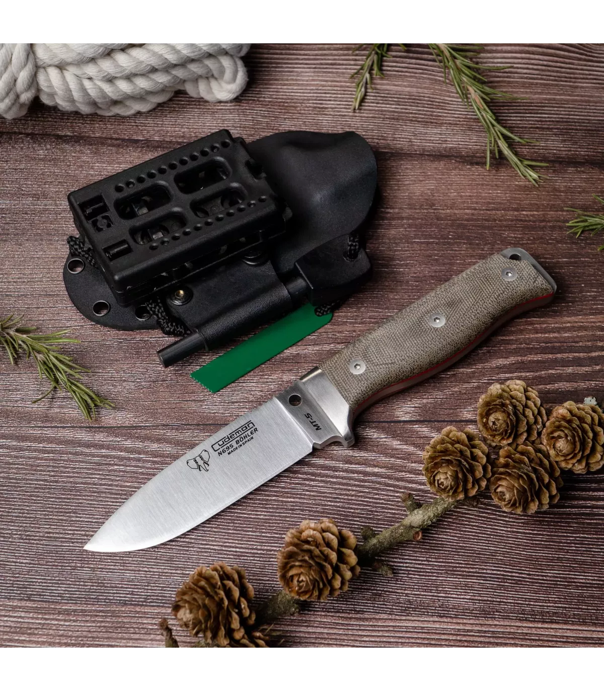 Siden lanceringen i 2012 har Cudeman MT-5 overgået sin historiske forgænger, Cudeman MT-1, takket være væsentlige forbedringer i stålet, designet og læderhylsteret. Fremstillet af Böhler N-695 stål, har denne hele kniv rustfrit stål A-304 viroler med satinfinish, og dens grønne canvas-håndtag med røde fiber-separatorer og perkushåndtag i enden sikrer et sikkert og behageligt greb.