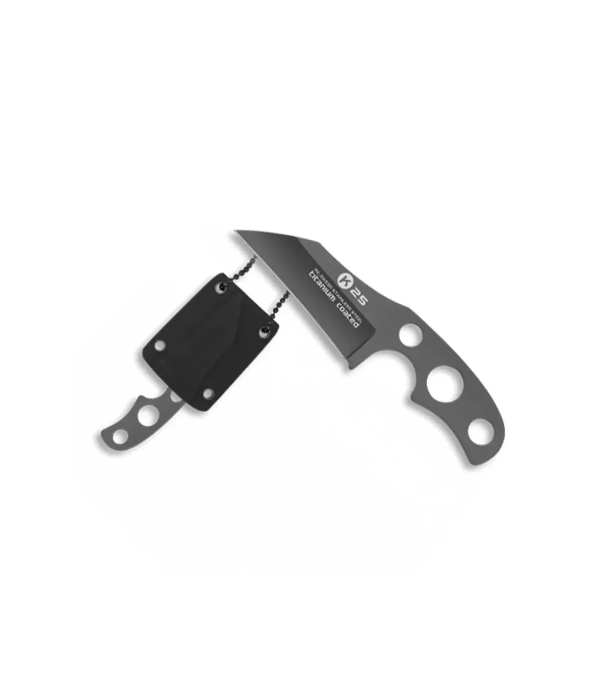 Med en samlet længde på 13 cm og et blad på 7 cm er denne kniv kompakt og nem at have med overalt. Derudover sikrer materialet i rustfrit stål belagt med titanium dens modstand og holdbarhed i ethvert miljø. Med en bladtykkelse på 3 mm kan denne kniv udføre præcise og effektive snit. Og for din største komfort inkluderer den et hængslet Kydex-tilbehør, der gør det muligt at bære den sikkert og let tilgængeligt hele tiden.