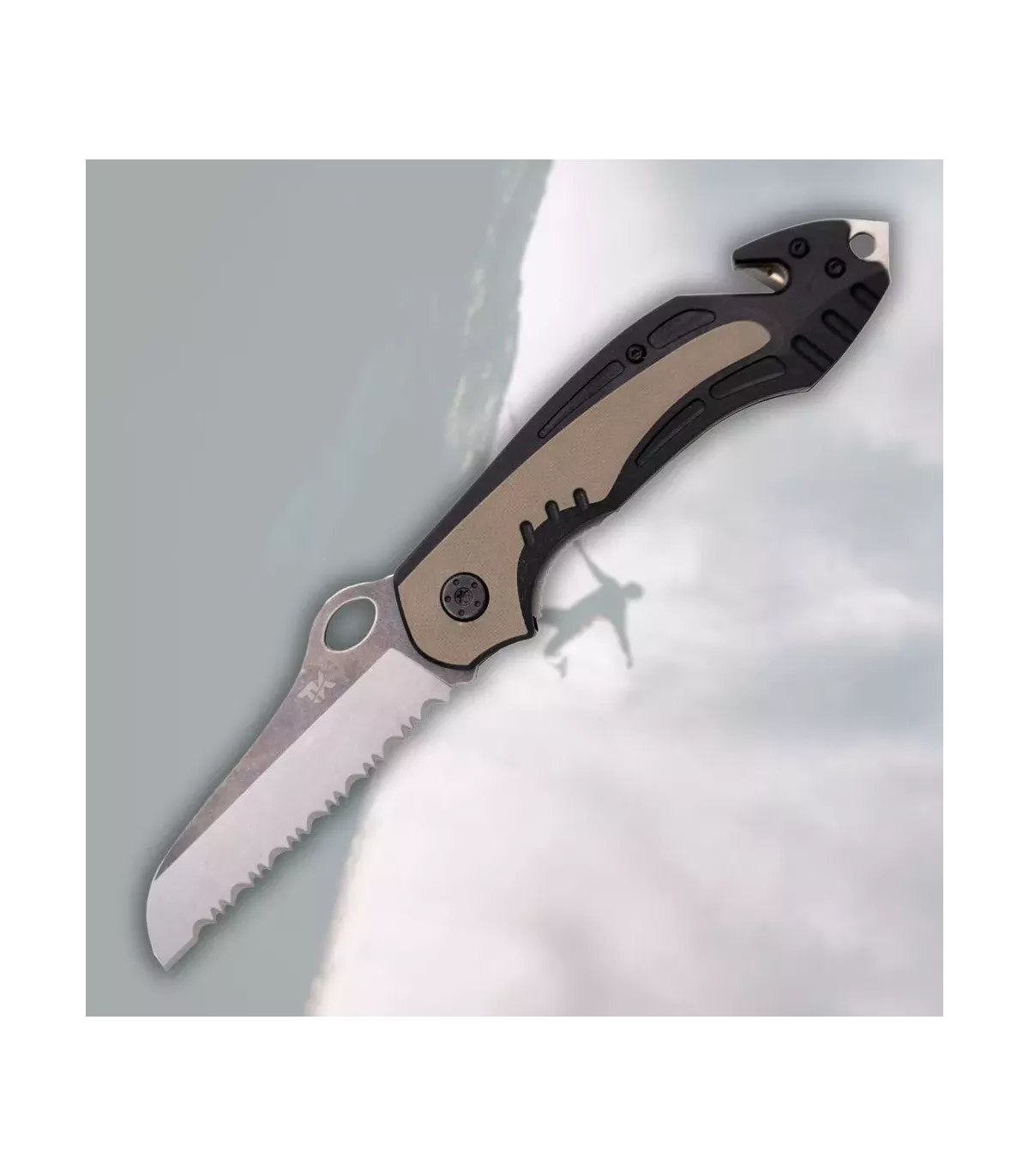 G10-håndtaget i to nuancer med skridsikker tekstur sikrer et fast og komfortabelt greb, selv under vanskelige forhold. Ud over sin skæreevne inkluderer denne kniv en kabelsav og en glasskærer, begge ideelle til nødsituationer i køretøjer eller overlevelsessituationer. Det indvendige låsemekanisme sikrer, at bladet forbliver stabilt under brug, mens den integrerede clips gør det nemt og sikkert at bære den.