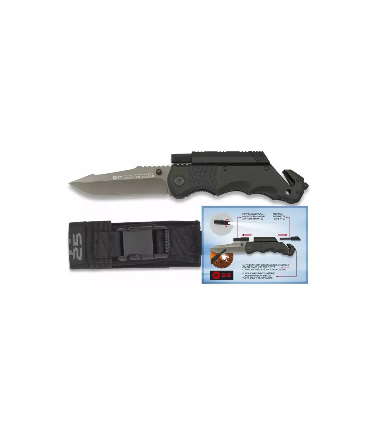 Den 9 cm lange blad er fremstillet af rustfrit stål med titaniumbadning, hvilket giver modstand mod korrosion og holdbarhed. Tykkelsen på 2,5 mm sikrer en perfekt balance mellem styrke og præcision i dine redningsopgaver.
