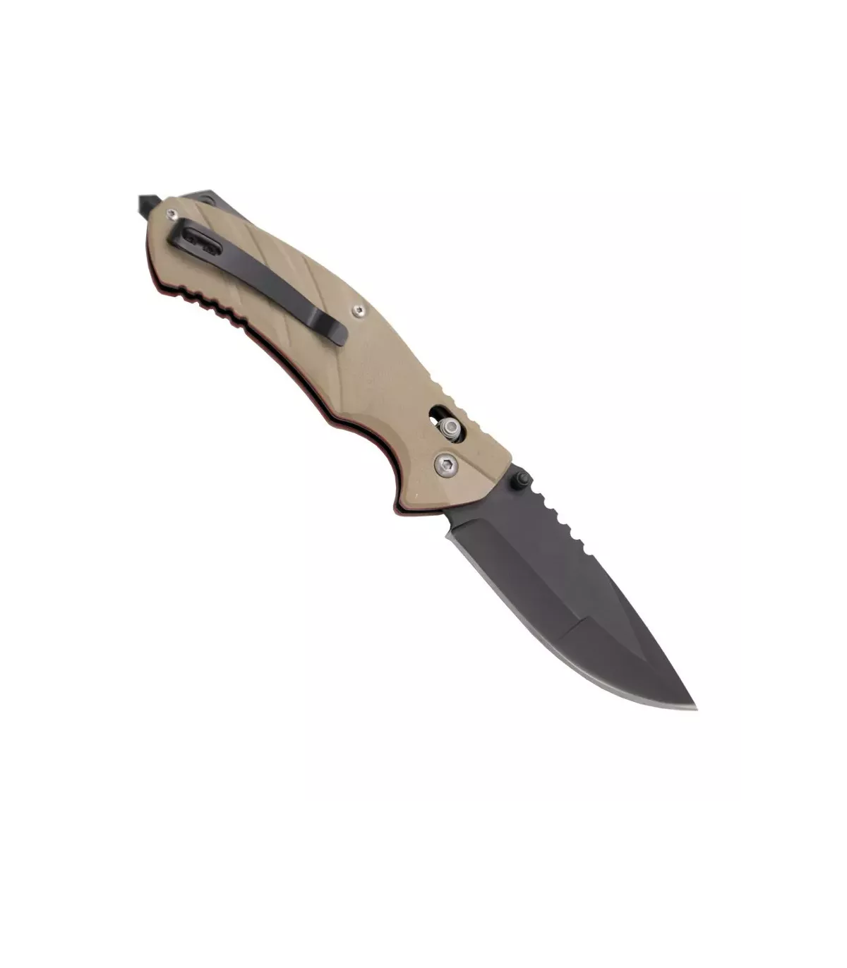Opdag Nøglen Third, et pålideligt og alsidigt værktøj designet til at imødekomme dine behov. Med et blad af rustfrit stål 420 og et tofarvet G10-håndtag i kamelton med en rød base, kombinerer denne kniv funktionalitet og stil i ét produkt.