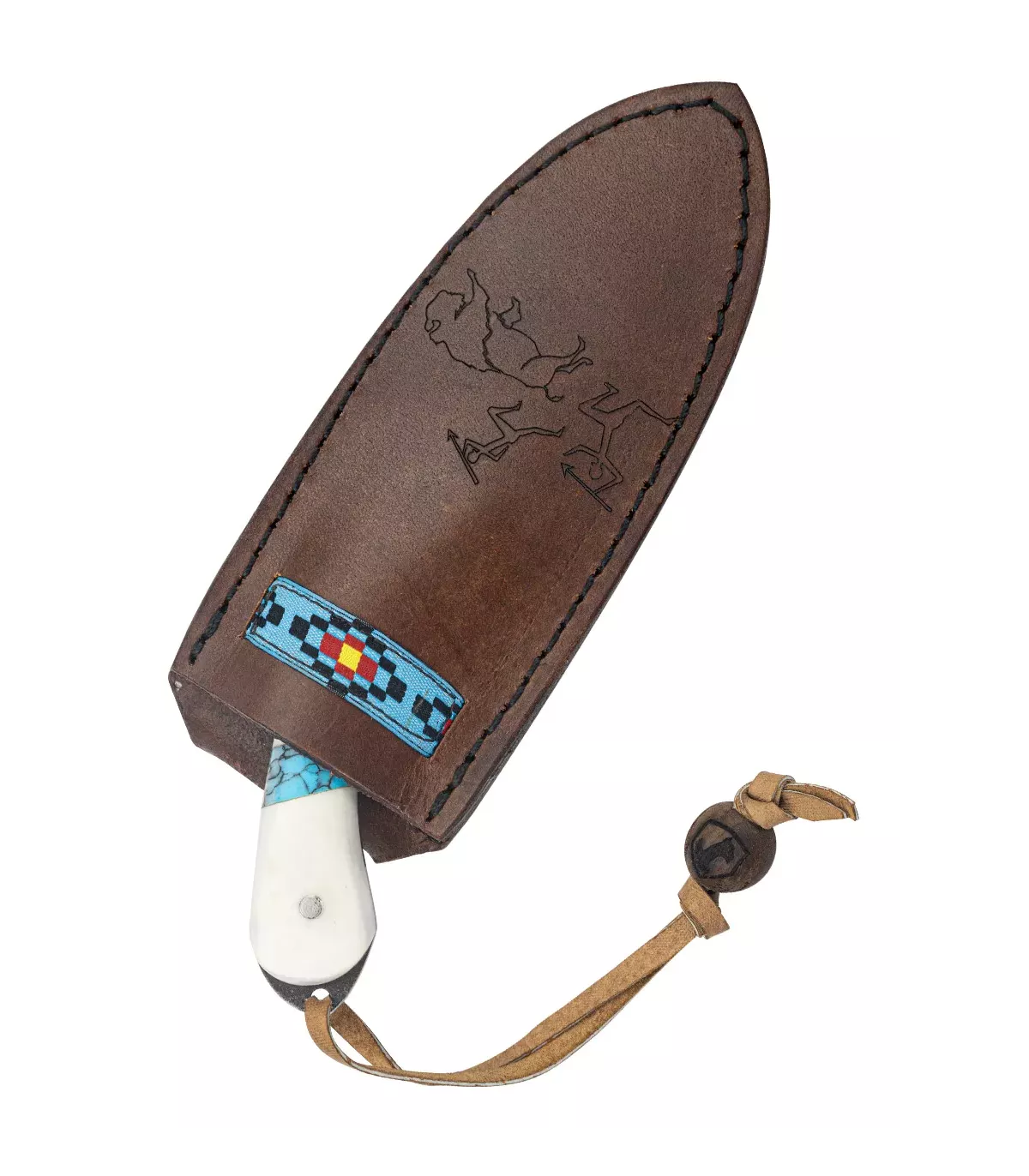 Hvert eneste detalje på denne kniv er omhyggeligt designet for at tilbyde både funktionalitet og æstetik. Bladet, med sine forge-tråde, har et rustikt udseende suppleret af et dekorativt arbejde på bagsiden. Kniven leveres med et håndlavet læderetui, dekoreret med en bisonjagt-scene og en farverig stofbånd med et indfødt mønster. Etuiet inkluderer også en bælteslynge på op til 6,5 cm bred, hvilket gør det nemt at bære kniven komfortabelt ved din side.