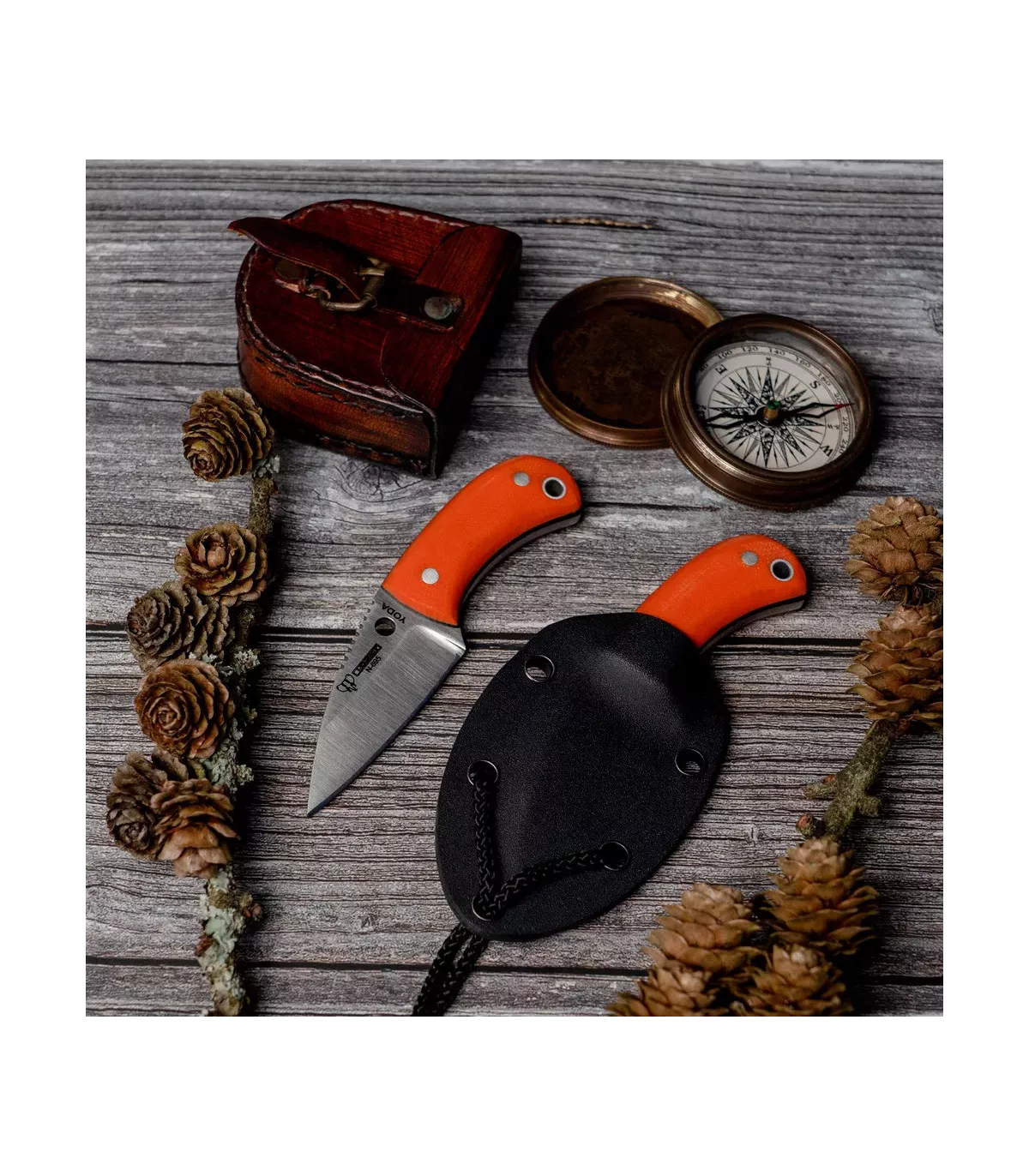 Yoda Kydex fuldkniv fra Cudeman med satinblad i nålspids-typen, fremstillet i Böhler N-695 stål. Håndtaget er lavet af orange G10-plast og er fastgjort med fladt aluminium. Den har et hul til snor med sort separator. Inkluderer kydex-hylster, paracord til at hænge om halsen og lynlås i kanten for forbedret greb.