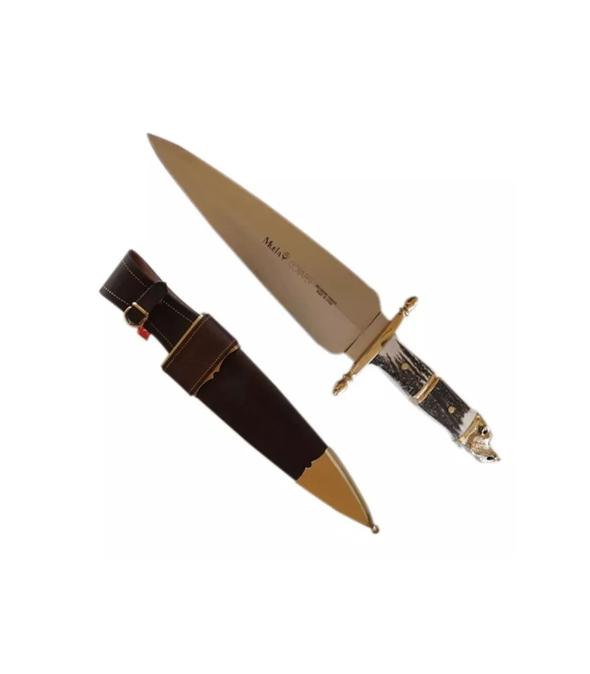 Entdecken Sie die Perfektion im vollständigen Abschlussmesser Muela Modell Covarsi. Dieses Messer ist der Inbegriff von Kunst und Handwerkskunst in der Welt der Jagd. Mit einer Klinge aus MoVa und einem Griff aus echtem Hirschgeweih mit einem Wildschweinkopf verbindet dieses Messer natürliche Schönheit mit außergewöhnlicher Funktionalität.