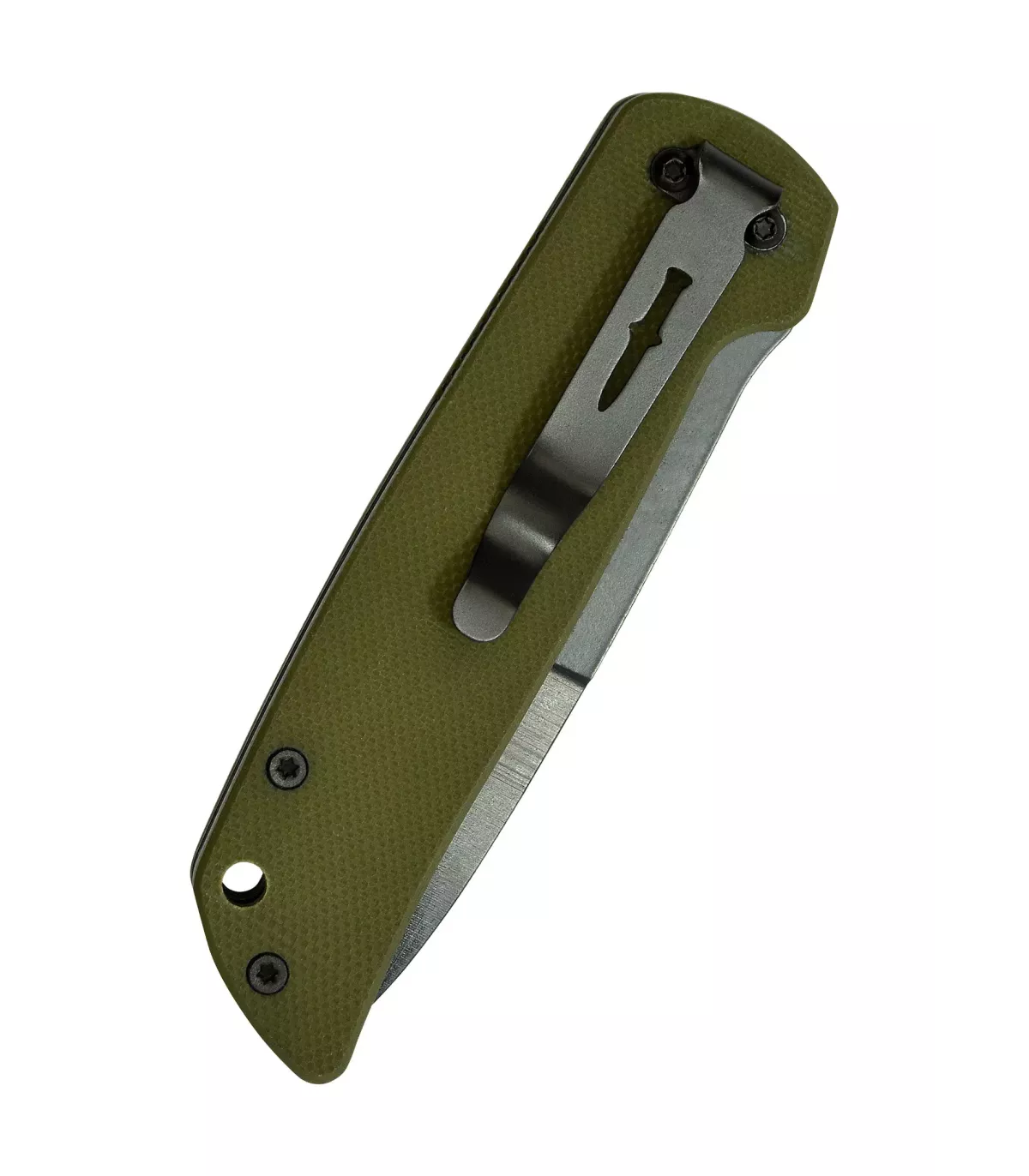- Diseño compacto y portátil: Con una longitud total de 17.1 cm cuando está desplegada, esta navaja es lo suficientemente compacta como para llevarla contigo a todas partes. Su mango rugoso con escalas de G-10 en verde oliva no solo proporciona un agarre seguro, sino que también añade un toque de estilo a tu equipo de aventura. Además, cuenta con un práctico orificio para cordón y un clip para cinturón para una portabilidad conveniente.