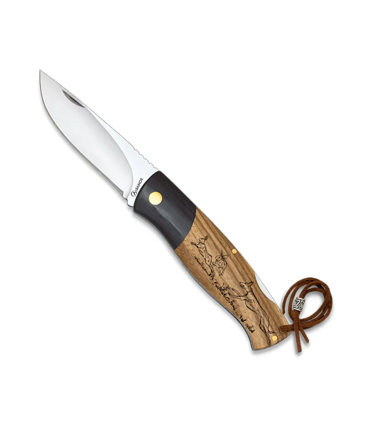 Grafisch inspiriert von der Natur, spiegeln die Materialkombinationen am Griff, zusammen mit schwarzen und goldenen Details, Eleganz und Funktionalität wider. Zudem verfügt es über eine Back-Lock-Sicherung, die bei jedem Schnitt und Schwenk Sicherheit bietet. Der Ring mit Kunstleder-Kordel ermöglicht es, das Messer bequem zu tragen oder sicher an Ihrer Ausrüstung zu befestigen.