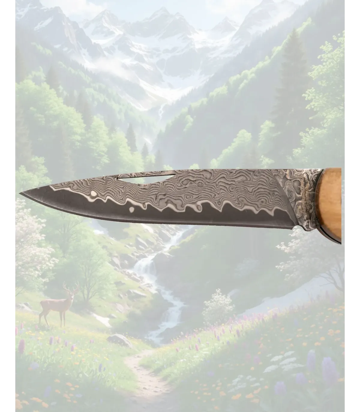 Der Griff aus hellem Holz bietet einen bequemen und natürlichen Halt, gestaltet, um sich der Hand anzupassen und das Halten zu erleichtern, selbst bei wiederholter Benutzung. Die sichtbaren Metallnieten und die Schraube der Achse vermitteln Solidität und Zuverlässigkeit im Mechanismus und ermöglichen zudem ein sanftes Öffnen dank der praktischen Einkerbung in der Klinge.