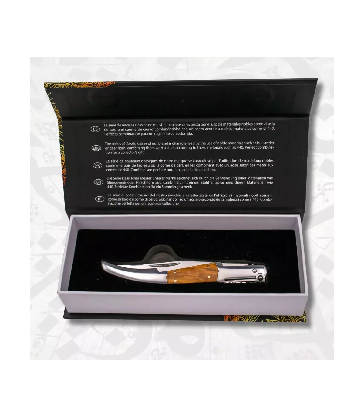 Ideal für Sammler oder Liebhaber, die handwerkliche Details schätzen, wird dieses Messer in einer Präsentationsbox geliefert, perfekt als Geschenk oder zur Ausstellung. Inspiriert von einem Universum, in dem Präzision und Stil essenziell sind, spiegelt sein Design die Liebe zum Detail und die Qualität wider, die Sie verdienen. Eine Option, die durch ihr glänzendes Finish, die Olivenholzeinlagen und das dekorative Finish hervorsticht und jeden Gebrauch zu einem außergewöhnlichen Schnitterlebnis macht.