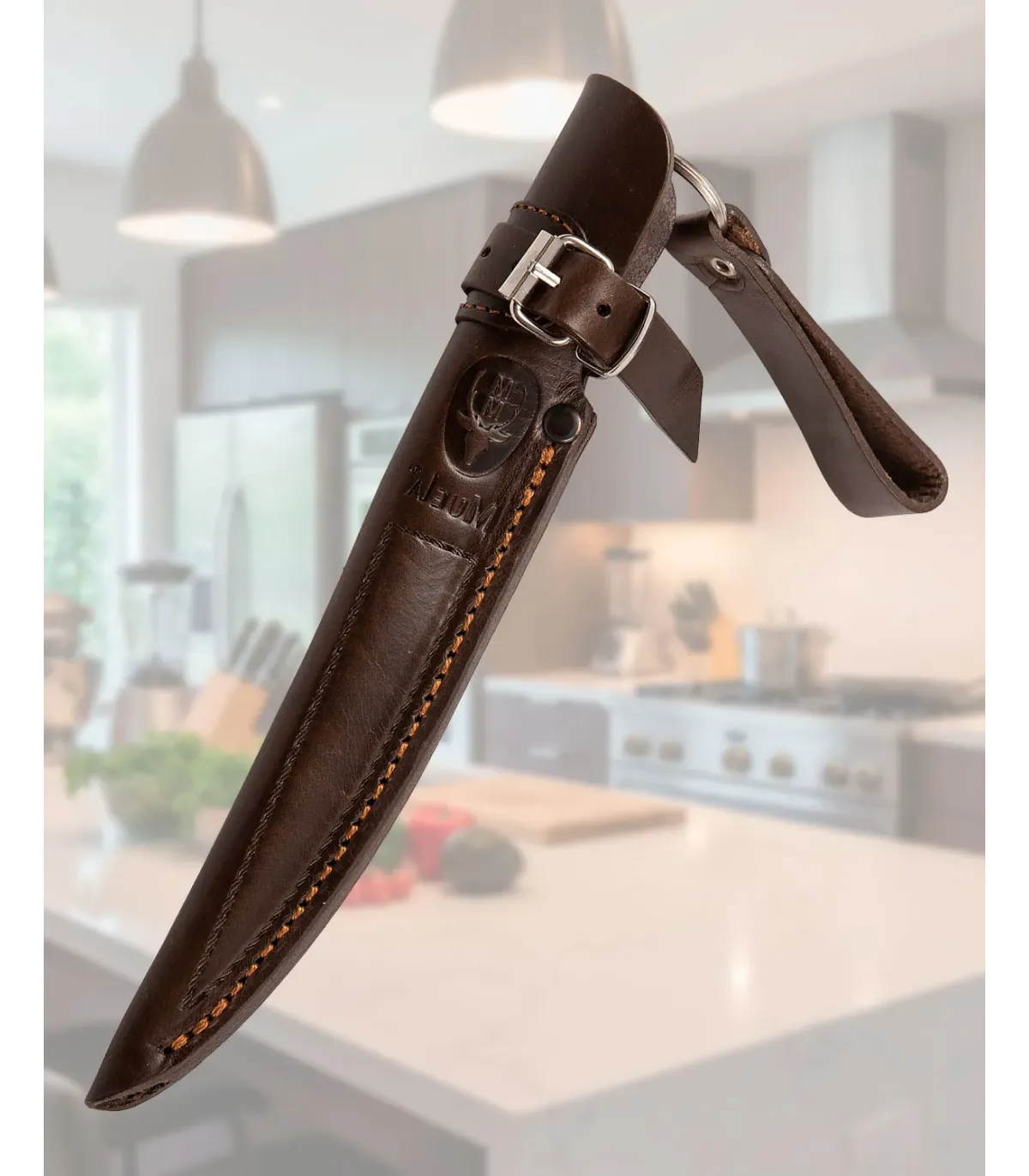 Die Lederscheide schützt die Klinge und erleichtert den Transport, wodurch die Schneide in optimalen Bedingungen bleibt und Sicherheit außerhalb der Küche gewährleistet wird. Wenn Sie das professionelle Filetiermesser für Fisch und Fleisch kaufen möchten, entdecken Sie ein elegantes und funktionales Design, das für anspruchsvolle Profis und Hobbyköche gedacht ist, die Präzision, Komfort und ästhetische Qualität in jedem Stück, das sie zubereiten, schätzen.