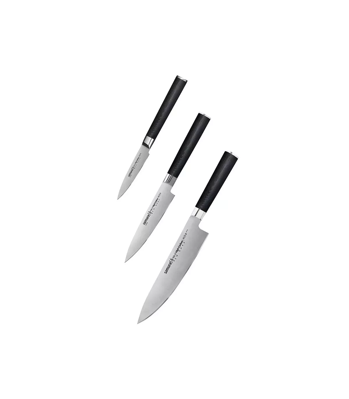 Das 3-teilige Kochmesserset der Samura-Serie MO-V ist das perfekte Set für professionelle Köche und Kochliebhaber. Dieses Set umfasst die drei vielseitigsten und am häufigsten verwendeten Küchenutensilien, geeignet für eine Vielzahl kulinarischer Aufgaben.