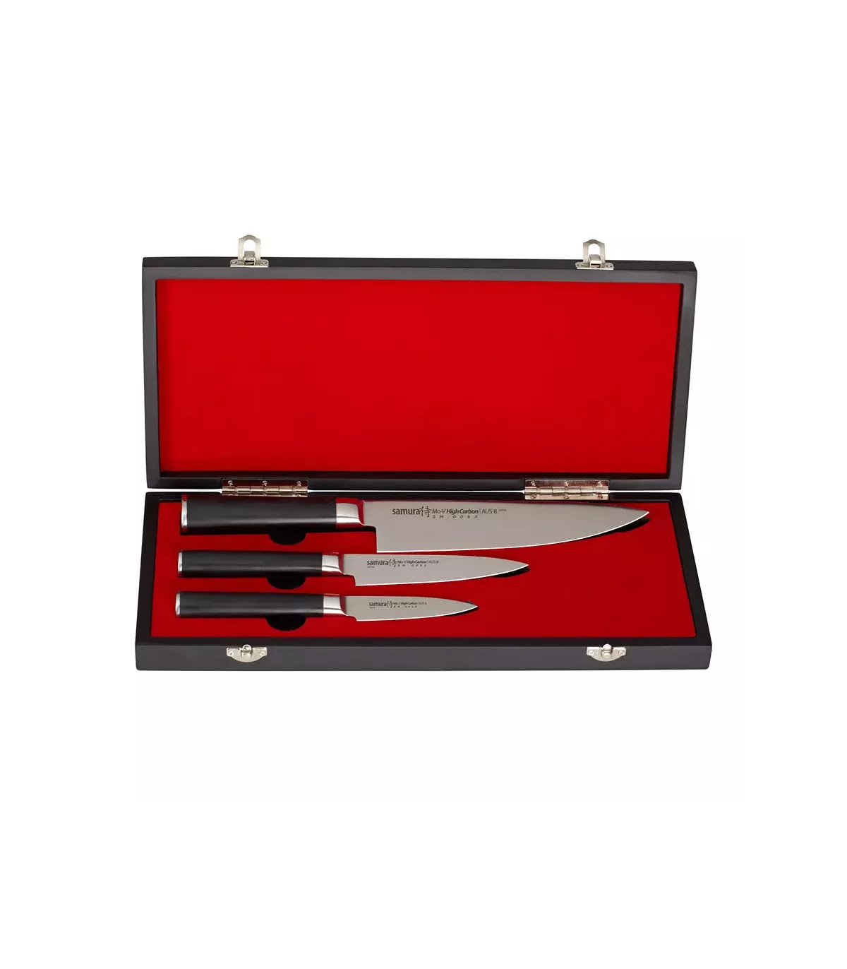 Fügen Sie das 3-teilige Kochmesserset der Samura-Serie MO-V Ihrer Sammlung kulinarischer Utensilien hinzu und genießen Sie seine Vielseitigkeit, Leistung und Langlebigkeit bei all Ihren kulinarischen Vorbereitungen. Erleben Sie die Qualität und das Vergnügen, mit diesen professionellen Messern zu kochen!