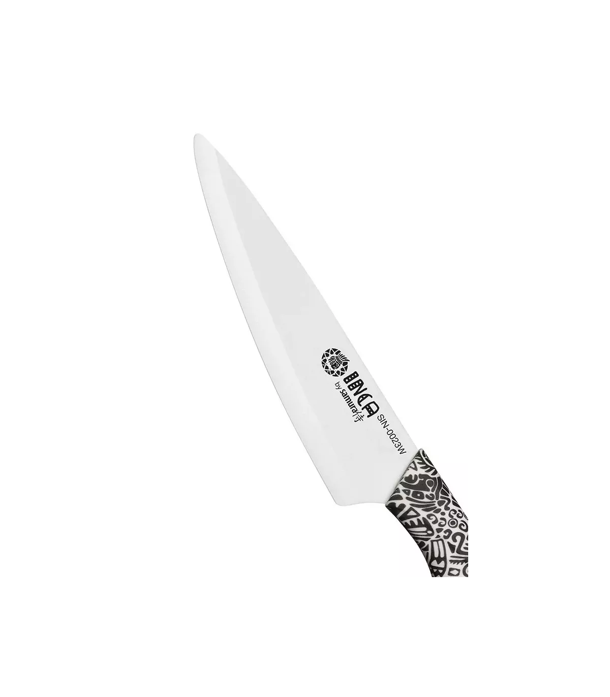 Die Messerklinge besteht aus weißem Zirkonoxid, das bei extrem hoher Temperatur für 48 Stunden sintert wurde, um eine außergewöhnlich harte Einkristallstruktur zu erreichen, die mit der Härte des Diamanten vergleichbar ist. Diese Keramikklinge bietet eine außergewöhnliche Schärfe und Langlebigkeit, was sie zu einem zuverlässigen und langlebigen Werkzeug in der Küche macht.