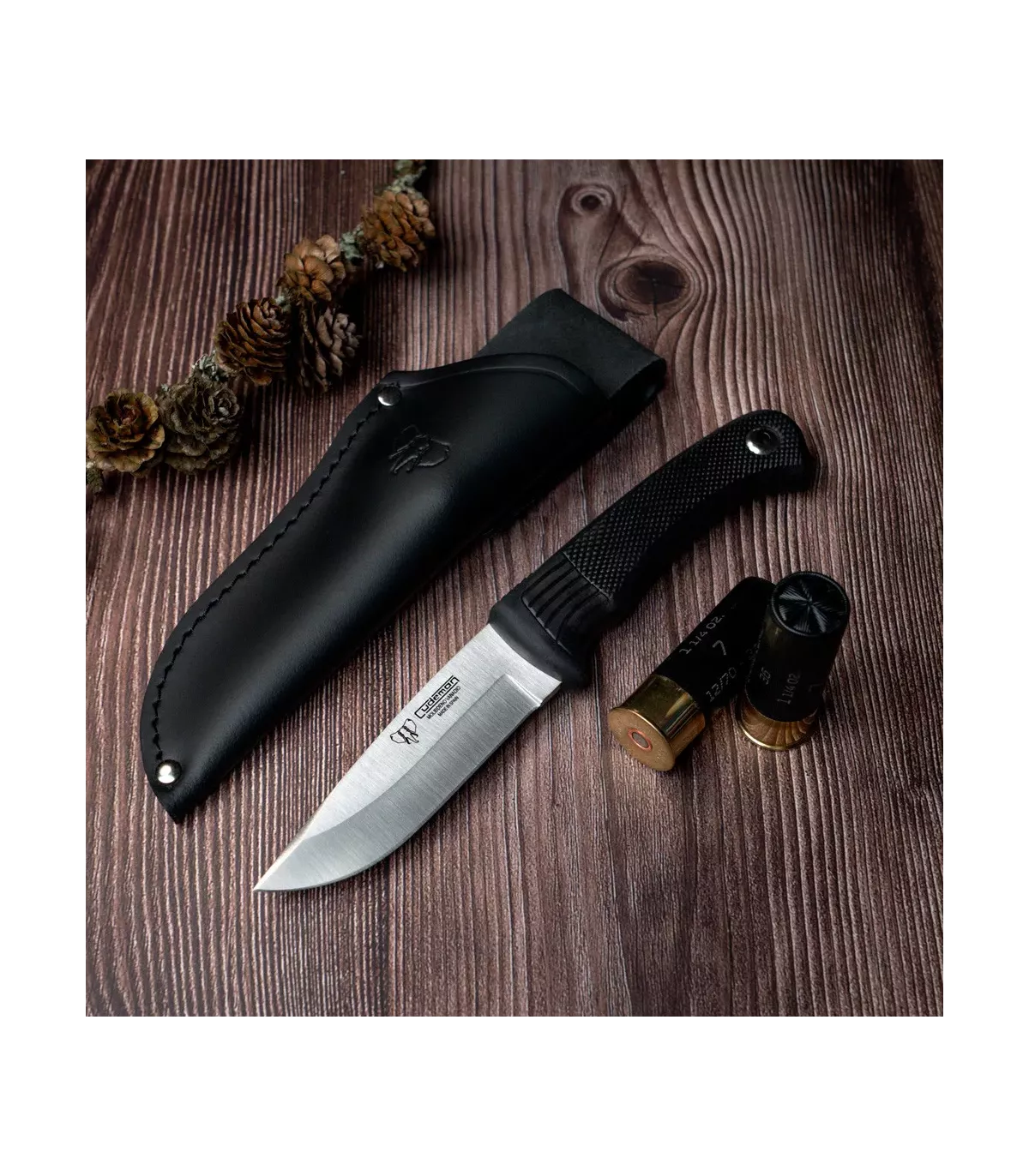Der schwarze Gummigriff mit 11 cm Länge bietet einen bequemen und sicheren Griff unter allen Bedingungen, sodass Sie das Messer präzise und mühelos führen können. Zudem enthält das Jagdmesser eine elegante Lederscheide, damit Sie es sicher transportieren und vor Witterungseinflüssen schützen können.
