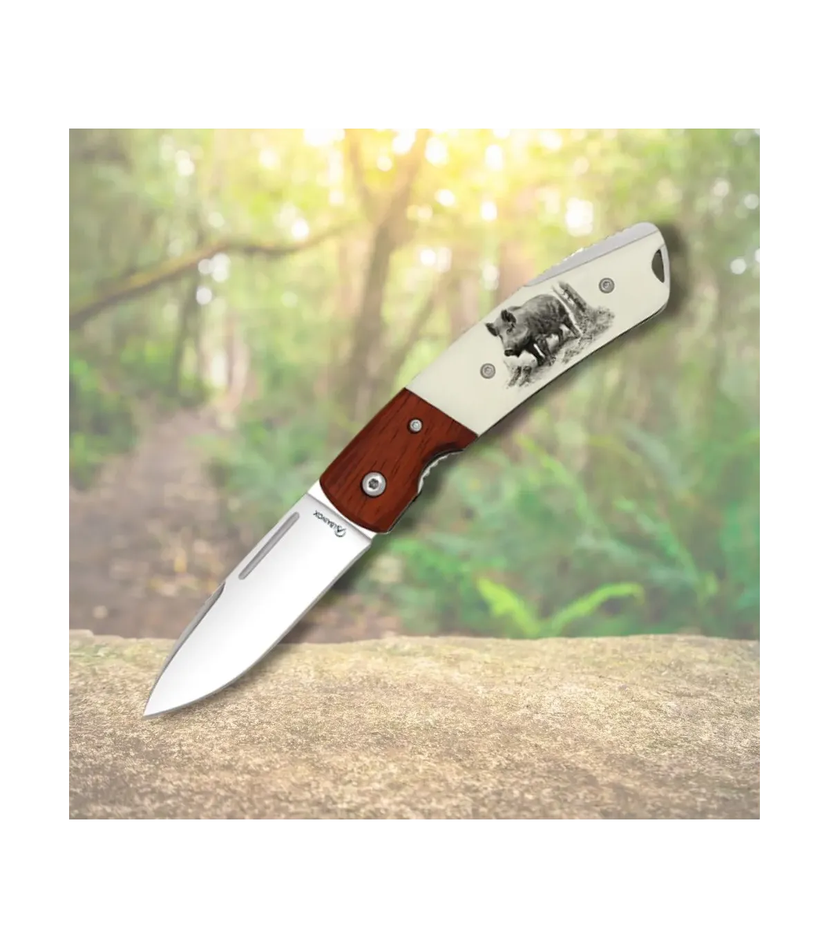 Der Griff, der perfekt an die Hand angepasst ist, kombiniert Materialien, die sowohl Leichtigkeit als auch Haltbarkeit bieten. Die detaillierte Gravur des Wildschweins verleiht eine markante Note, die Stärke und Verbundenheit mit der Natur widerspiegelt, während das ergonomische Design mit sichtbaren Schrauben eine feste und stabile Handhabung für präzise Manöver verspricht.