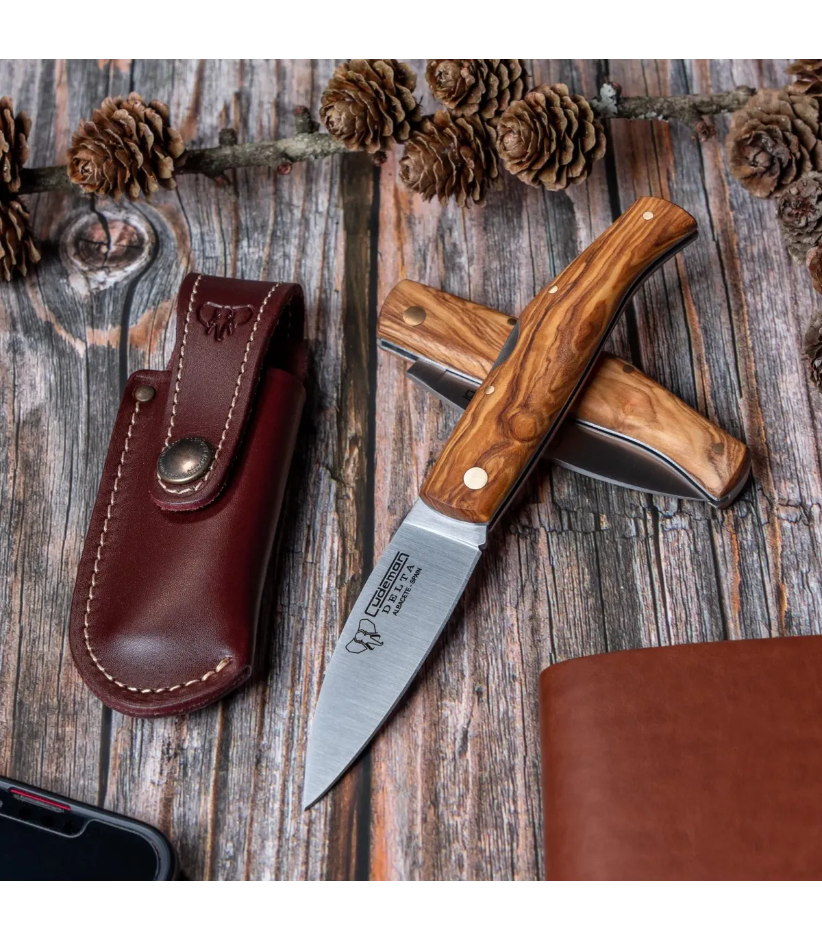 Mit einer Stahlhärte von 54/56 HRc ist dieses Messer ein Synonym für Widerstandsfähigkeit und Langlebigkeit. Das Verriegelungssystem mit Zentralverschluss bietet zusätzliche Sicherheit, indem es die Klinge während des Gebrauchs fest und stabil hält. Die Befestigung des Griffs mit Messingfaden sorgt für einen soliden und komfortablen Halt zu jeder Zeit. Der Griff aus naturbelassenem satiniertem Olivenholz ist nicht nur ästhetisch ansprechend, sondern bietet auch einen ergonomischen und rutschfesten Griff, selbst unter widrigen Bedingungen.