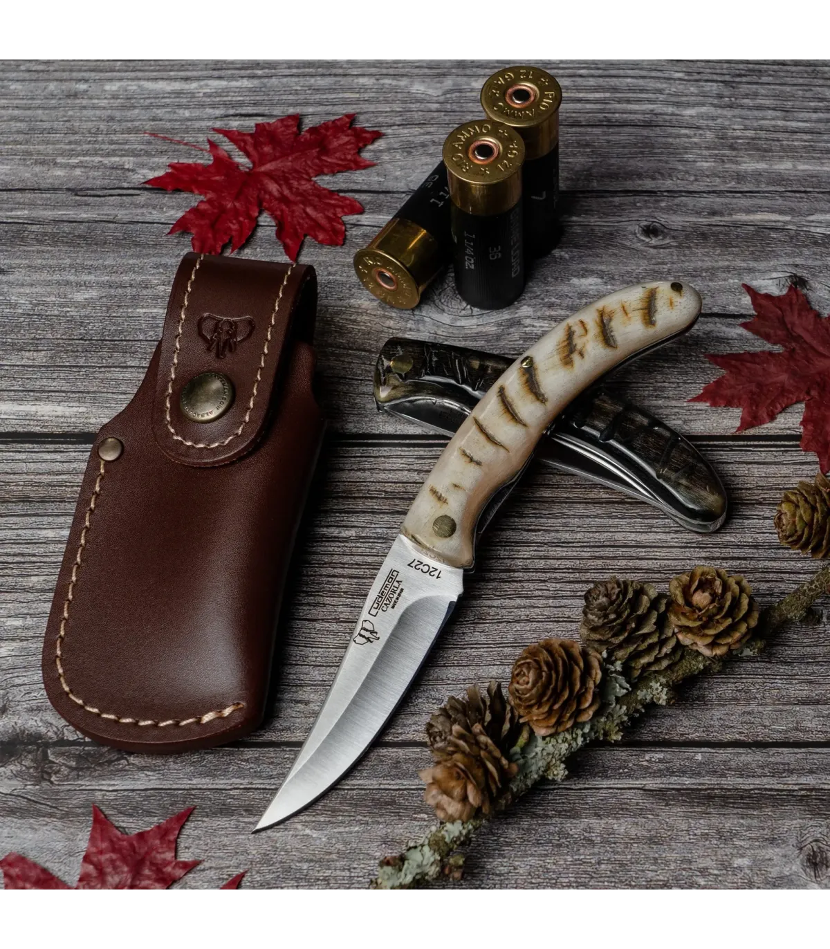 Der Griff aus poliertem Widderhorn verleiht diesem Messer einen Hauch von Eleganz und Authentizität. Neben seinem ansprechenden Aussehen sorgt der polierte Widderhorn-Griff für einen ergonomischen und rutschfesten Halt, der auch unter schwierigen Bedingungen eine sichere Handhabung gewährleistet. Das Cazorla-Messer wird mit einem braunen Lederholster geliefert, das nicht nur zusätzlichen Schutz bietet, sondern auch den klassischen und anspruchsvollen Stil des Messers unterstreicht.