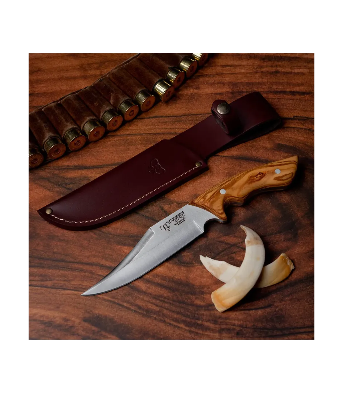 Der Griff aus satiniertem Olivenholz verleiht dem Messer nicht nur eine elegante Note, sondern sorgt auch für einen bequemen und sicheren Griff, selbst unter schwierigen Bedingungen. Die natürliche Schönheit des Olivenholzes verbindet sich mit der Langlebigkeit und Widerstandsfähigkeit des Messers und schafft ein einzigartiges und außergewöhnliches Stück.