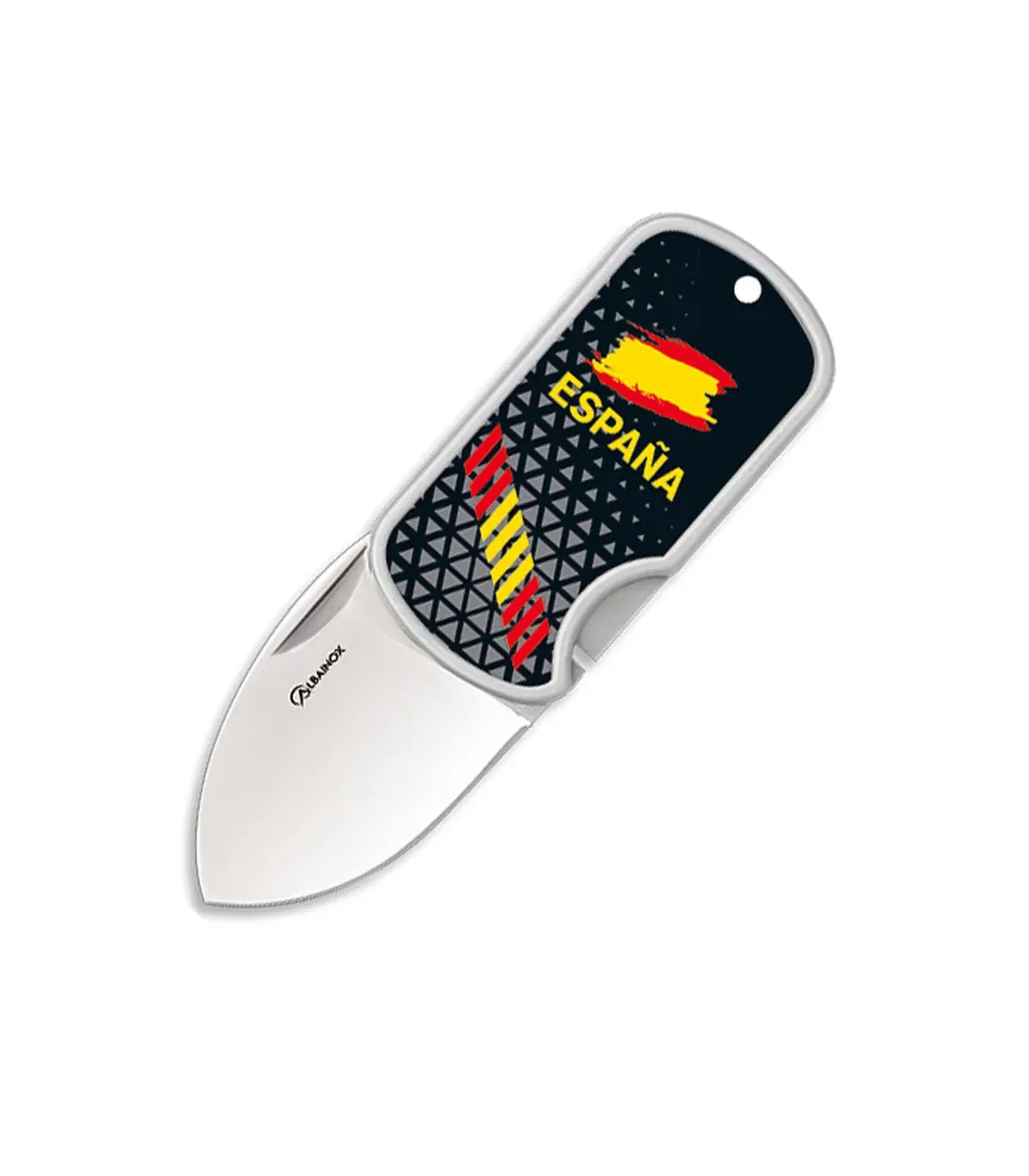 Navaja bandera española, con hoja en acero 3CR13MOV satinado de un solo filo y mango en aluminio + 3D con clip para cinturón. Tipo de bloque Frame Lock. Tamaño de la hoja: 4 cm.