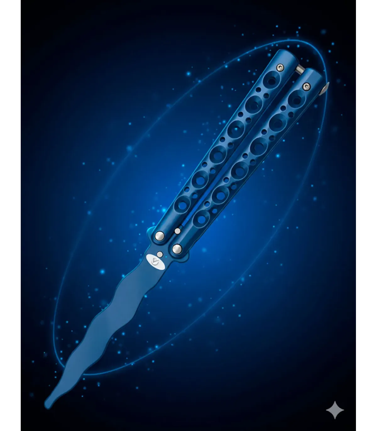 Inspiriert vom Stil der Butterfly-Messer, auch bekannt als Balisong, ist sein Design mit Löchern und gewellter Klinge nicht nur optisch beeindruckend, sondern erleichtert auch den Griff und die Handhabung. Ob für Training oder Sammlung – dieses blaue Flammmesser vereint Stil und Funktionalität in jedem Detail, eine Wahl für diejenigen, die den Unterschied machen möchten!