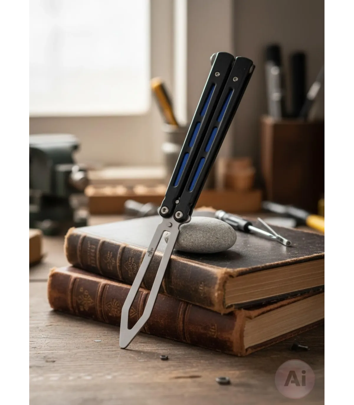 Suchen Sie ein vielseitiges und stilvolles Werkzeug für Ihre Übungen oder Sammlungen? Dieses Taschenmesser Fächerübung Third, mit einem Design, das vom klassischen Balisong-Messer inspiriert ist, bietet Präzision und Komfort bei jeder Bewegung. Sein schwarzer Finish-Griff mit blauen Details verleiht nicht nur einen modernen Touch, sondern sorgt auch für einen festen und sicheren Griff während der Verwendung.