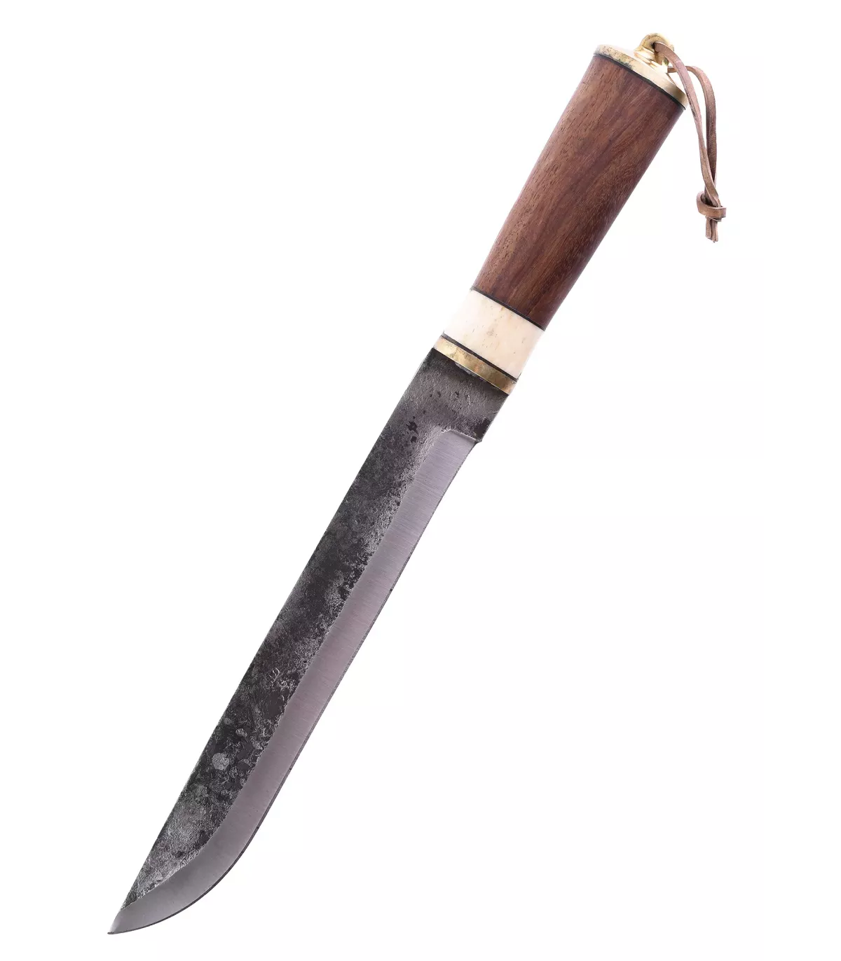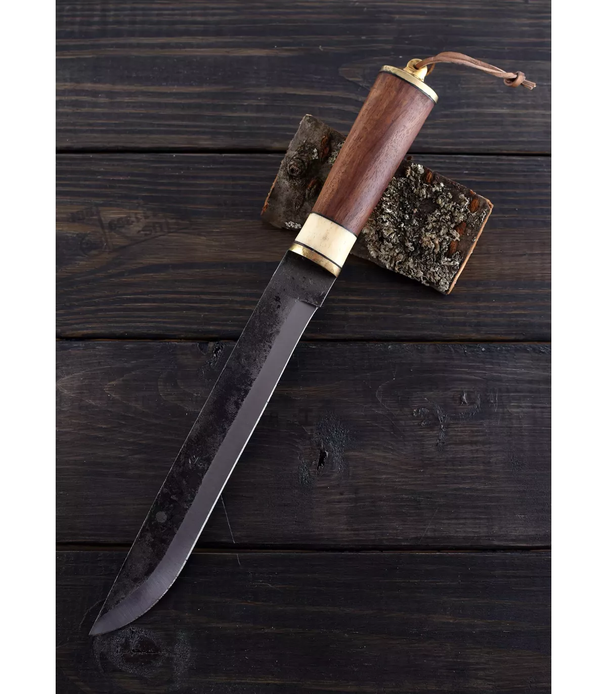 Its high-carbon steel blade, with a finish that shows forge marks, not only guarantees sharp precision but also adds an authentic and handcrafted touch. The blade length and balanced weight facilitate various tasks, from cutting to food preparation, without sacrificing comfort or control. The handle, made of wood with bone inlays, provides a firm and elegant grip, while the bronze collar and the plate on the back, with a hole for the cord, add a touch of distinction and additional functionality.