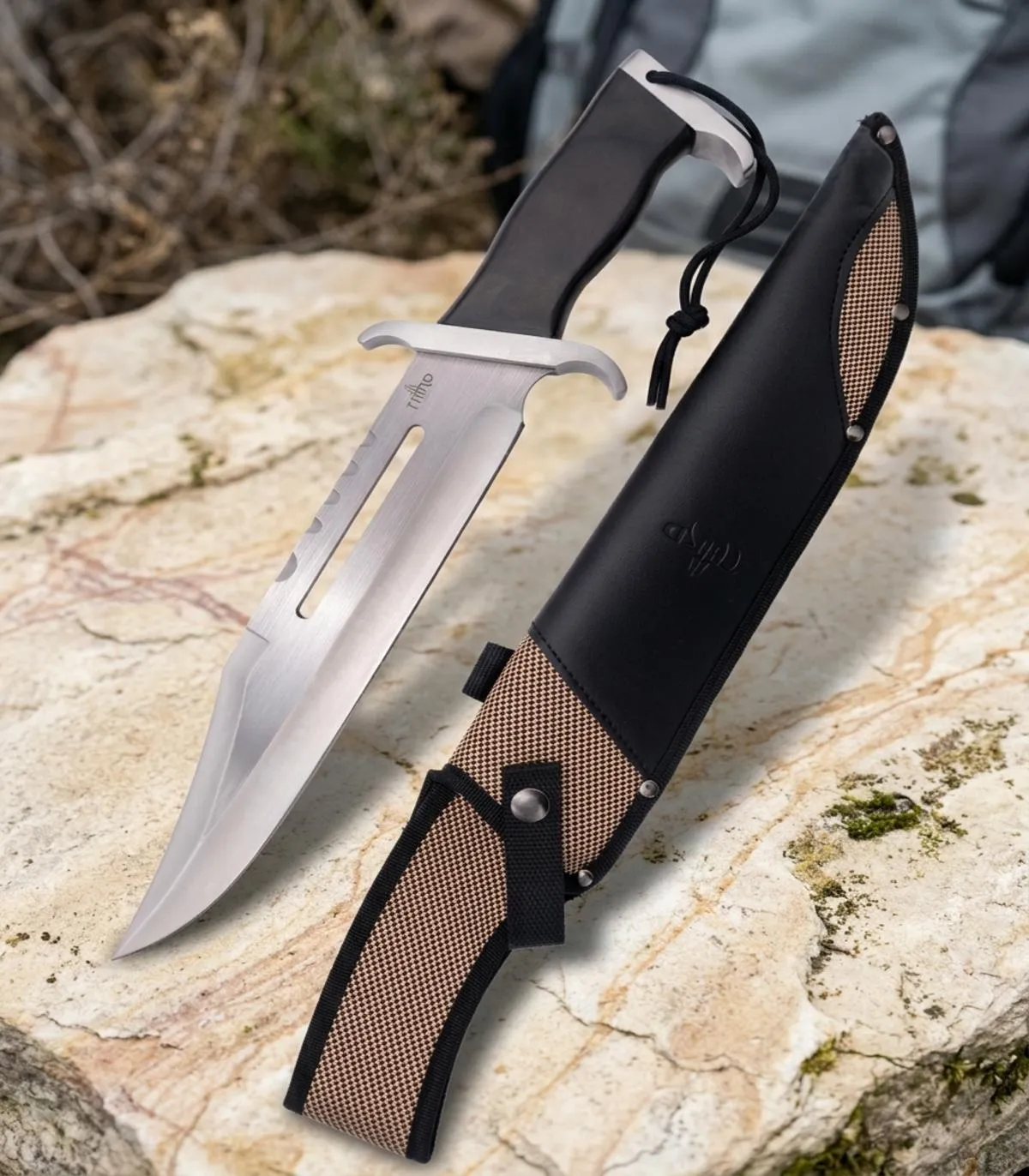 Built for those who take the initiative, the 'Third Tactical Knife' transforms your movements and projects an image of confidence. The blade, with a polished finish that reflects precision, allows for clean and secure cuts, while its design featuring cutouts and grooves not only showcases aesthetic innovation but also reduces weight and enhances maneuverability. The metal guard reinforces your safety, protecting your hand in every decisive action, and the ebony wood handle, with its ergonomic finish, ensures a firm and comfortable grip during long hours. The high-density nylon sheath, reinforced with visible seams and a metal closure, offers protection and transport without compromising your style. Completing a set that projects authority and dominance, capable of accompanying you in extreme contexts or simply in the daily routine where your presence makes the difference.