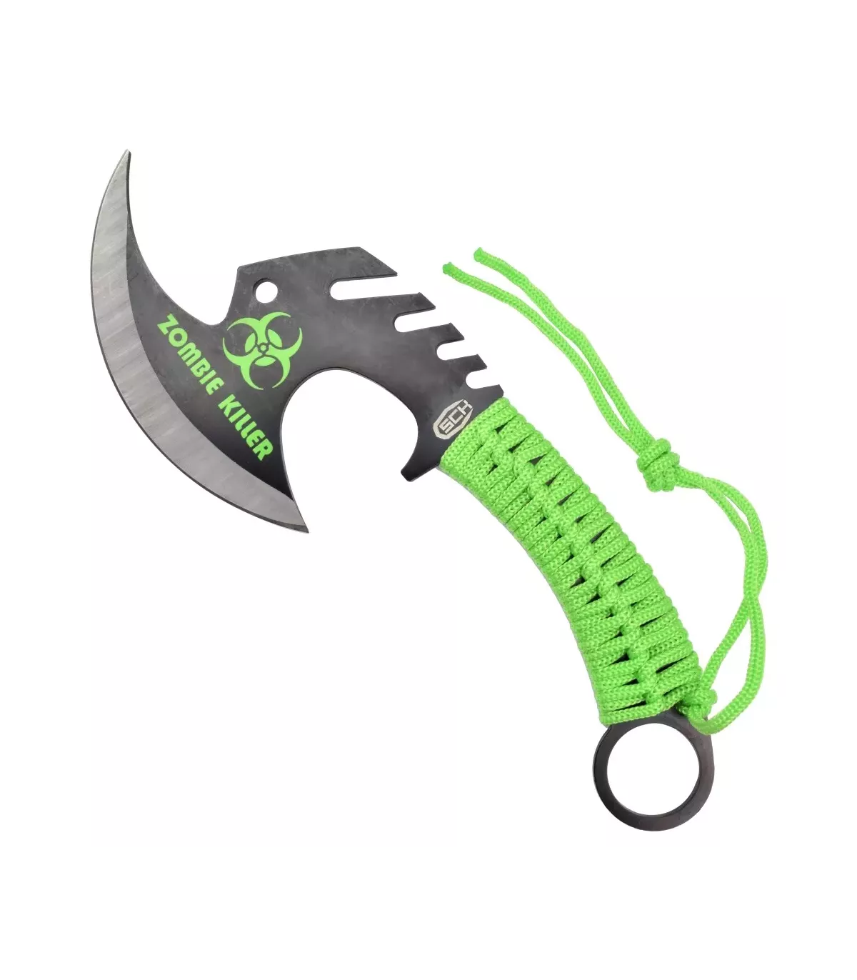 The handle coated with green paracord ensures a comfortable and secure grip, even in wet or slippery conditions. Furthermore, it is decorated with the biohazard logo and the words Zombie Killer, making this axe a unique and eye-catching piece for any weapon collection.