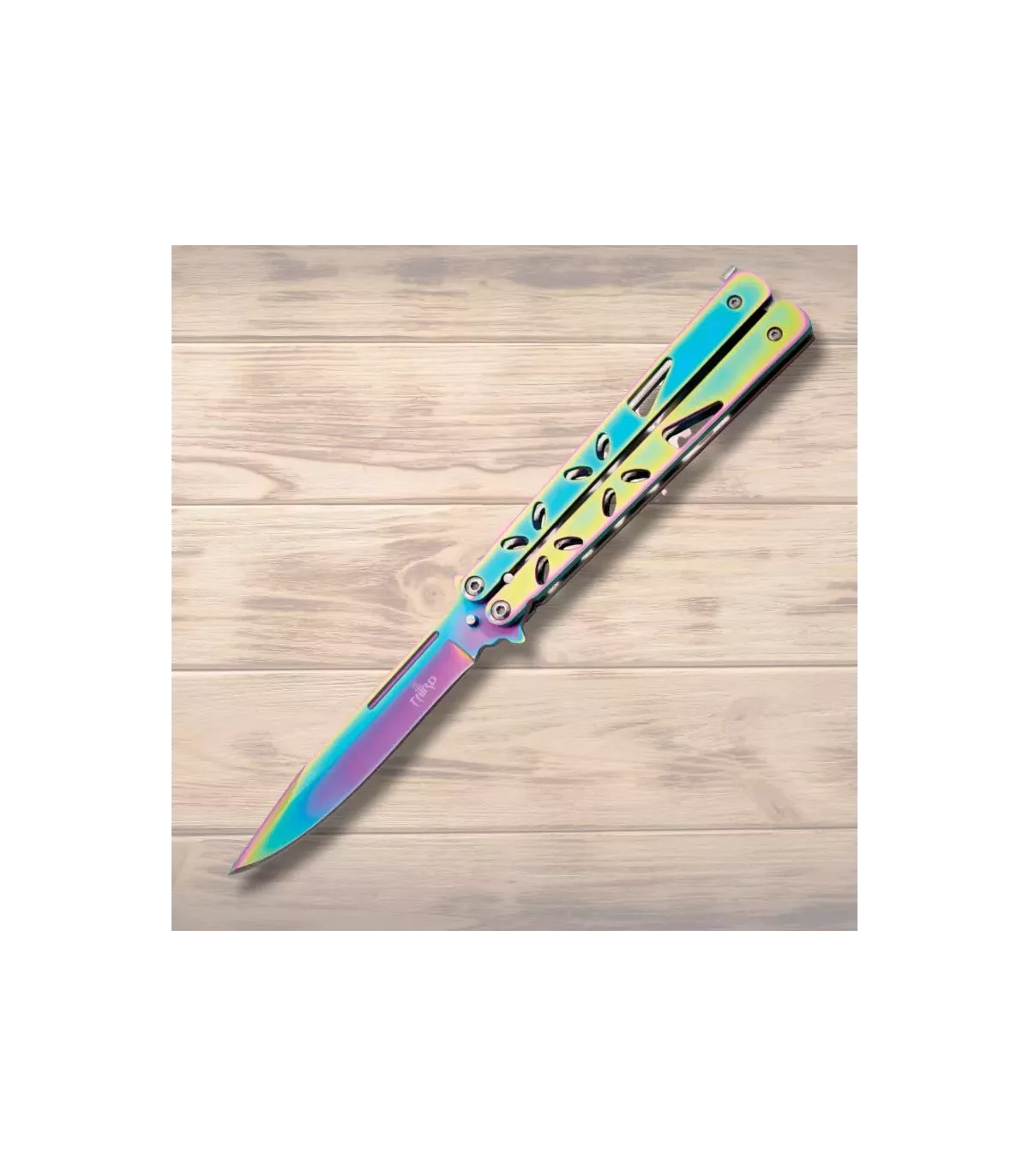 Its stainless steel handle with the same rainbow finish, equipped with strategic holes, reduces weight to only 110 grams, facilitating quick maneuvers and movements without sacrificing durability. With an overall length of 22 cm and a handle length of 12 cm, its balanced design offers greater control and comfort during use. The balisong or fan-style opening mechanism allows smooth and precise movements, making it ideal for both collectors and enthusiasts of the art.