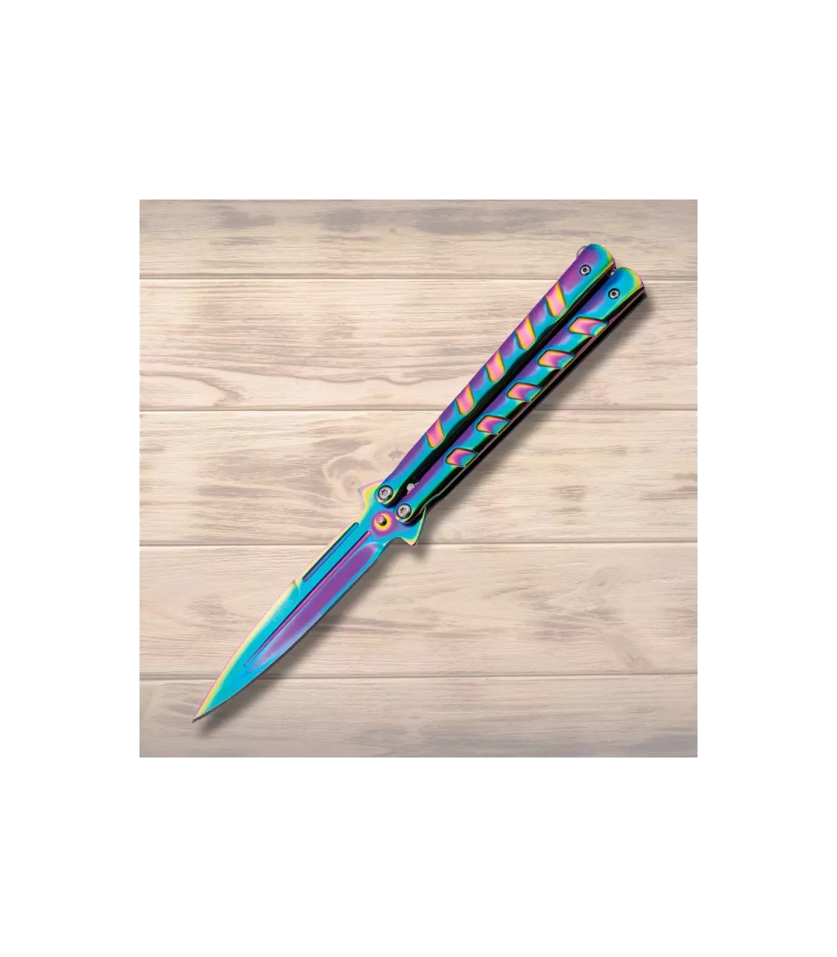 Its iridescent color design combines blue, purple, and green tones, creating a visual effect that captivates with every movement. Thanks to its butterfly knife (balisong) structure, you can perform tricks and maneuvers easily, while enjoying a secure grip thanks to its stainless steel handle also coated in rainbow titanium, which provides durability and a shiny finish that does not go unnoticed.